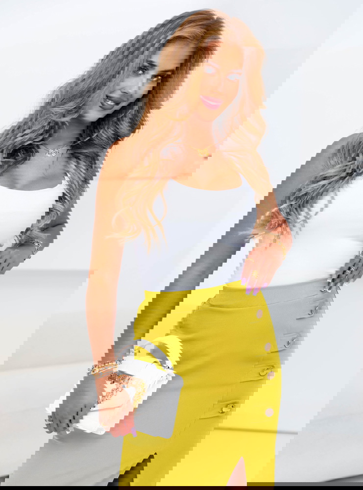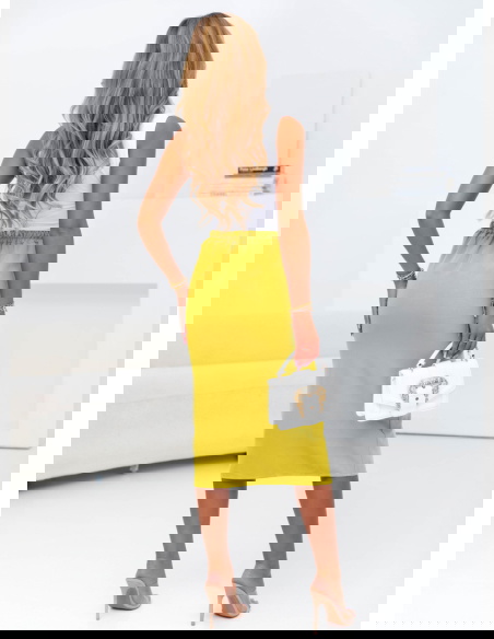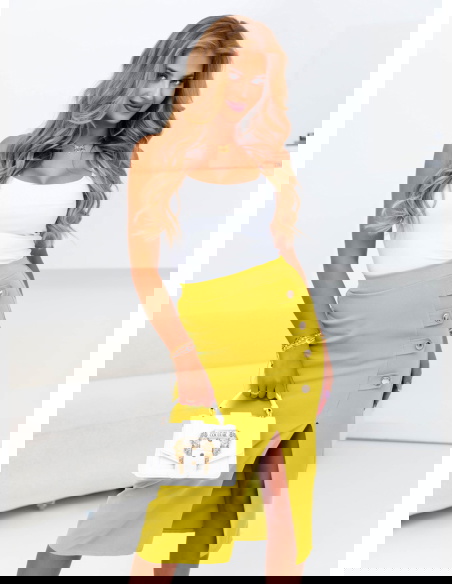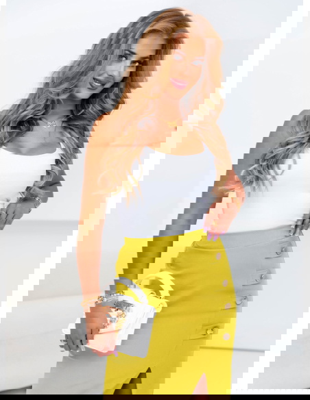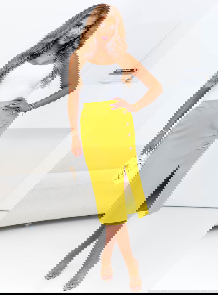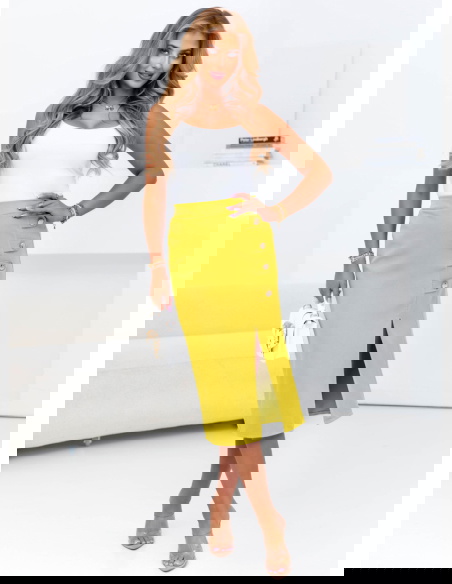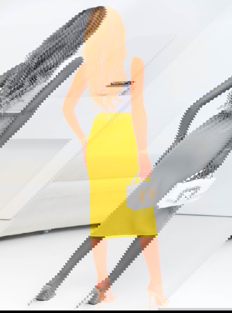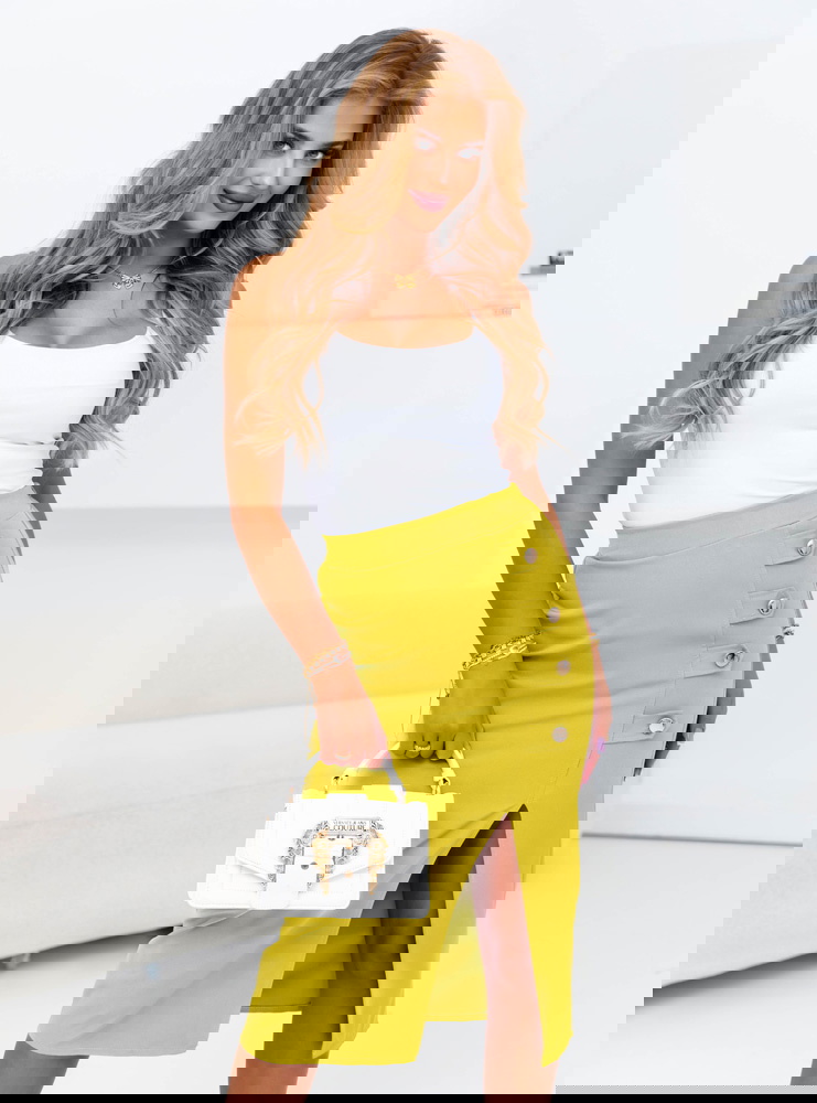 Limonkowa spódnica z rozcięciem Elianne to modowa perełka, która pozwoli Ci wyróżnić się z tłumu. Pięknie modeluje sylwetkę, podkreślając talię i optycznie wydłużając nogi.