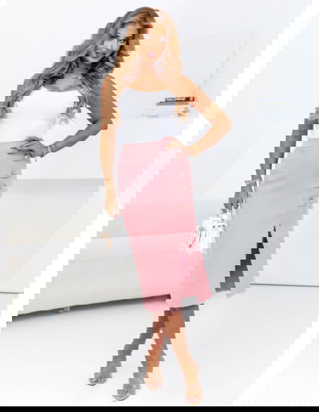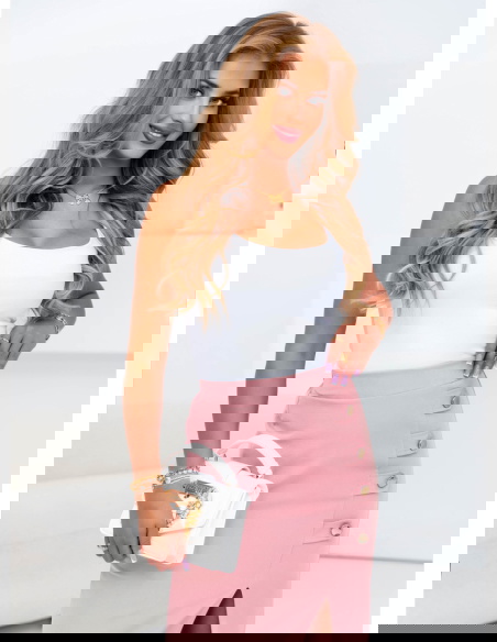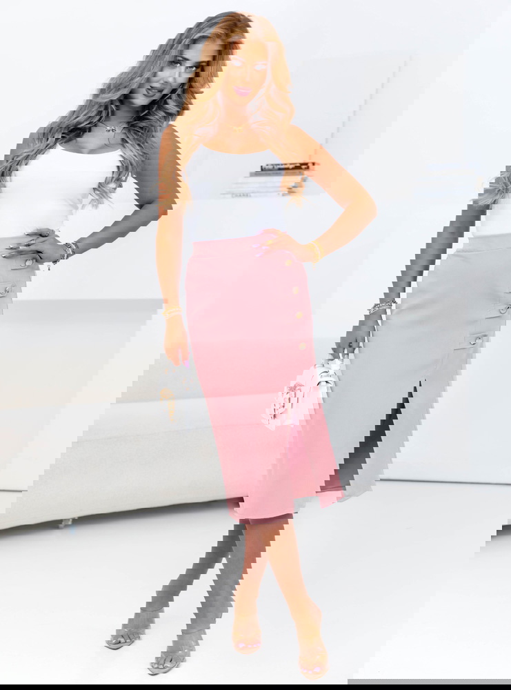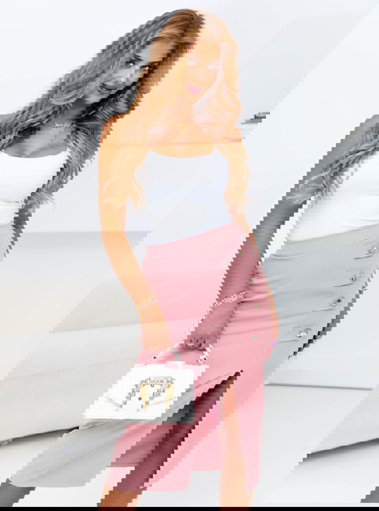 Spódnica z rozcięciem Elianne - brudny róż to propozycja dla kobiet, które kochają klasykę z nutką nowoczesnego charakteru. Delikatny, przygaszony odcień różu nadaje całości subtelności i elegancji, a przy tym jest niezwykle łatwy do stylizowania. Spódnica ma długość midi, dzięki czemu prezentuje się bardzo kobieco, ale też zapewnia wygodę w codziennym noszeniu. Wysoki stan pięknie podkreśla talię, modelując sylwetkę i wydłużając optycznie nogi. Rozcięcie na nodze dodaje jej lekkości i seksapilu, sprawiając, że nawet prosta stylizacja nabiera charakteru. Ozdobne guziki z boku to modny detal, który przyciąga wzrok i dodaje całości modowego sznytu. To model, który świetnie sprawdzi się zarówno na co dzień, jak i na bardziej formalne wyjścia. Brudny róż to kolor, który pasuje niemal do wszystkiego – od bieli, przez beże, aż po ciemniejsze odcienie. Jeśli szukasz spódnicy, która jest jednocześnie klasyczna i wyróżniająca się – właśnie ją znalazłaś.