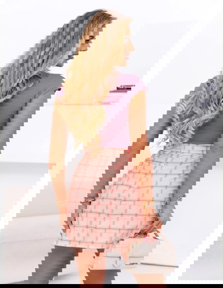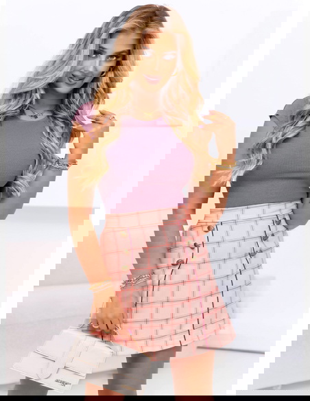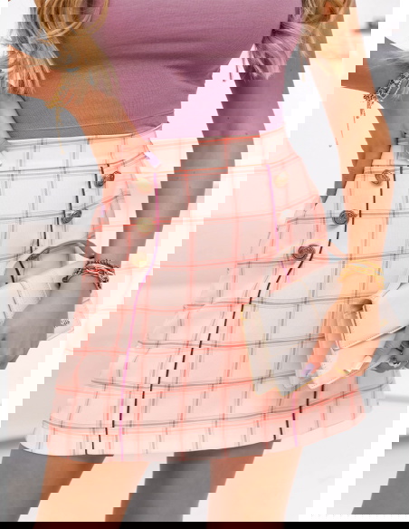 Pudrowa spódniczka w kratę z ozdobnymi guzikami Ladeya