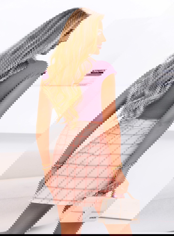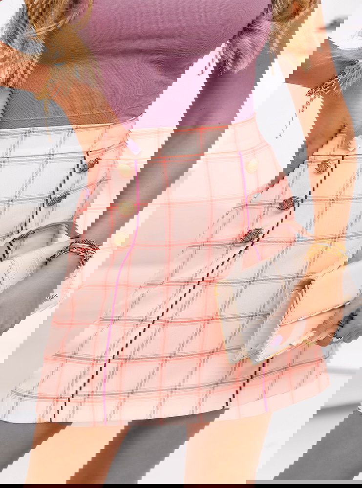 Pudrowa spódniczka w kratę z ozdobnymi guzikami Ladeya jest świetna na co dzień – do pracy, szkoły czy na zakupy. Doskonale sprawdzi się też podczas spotkań ze znajomymi czy na luźne randki.