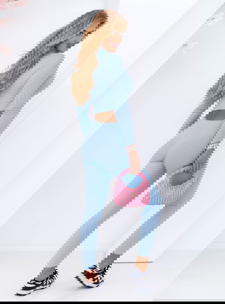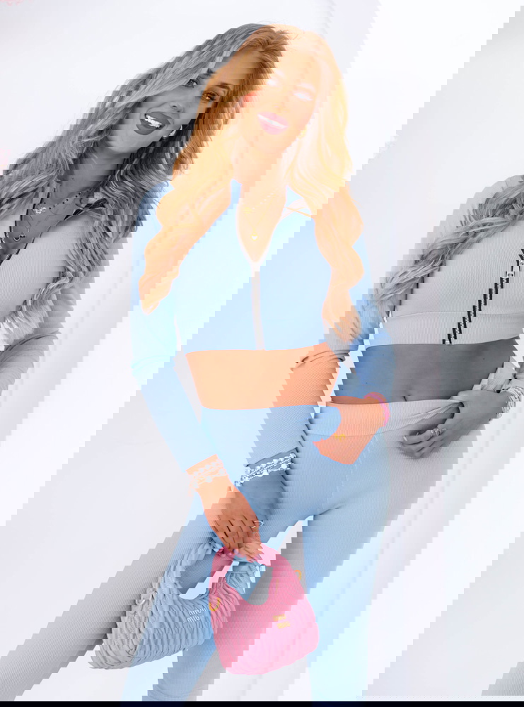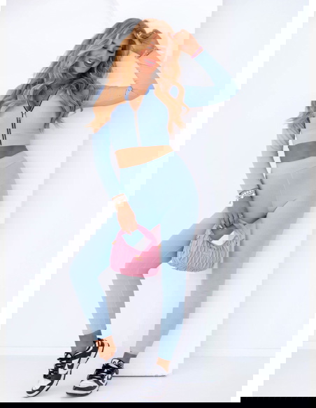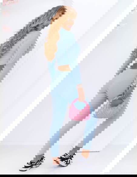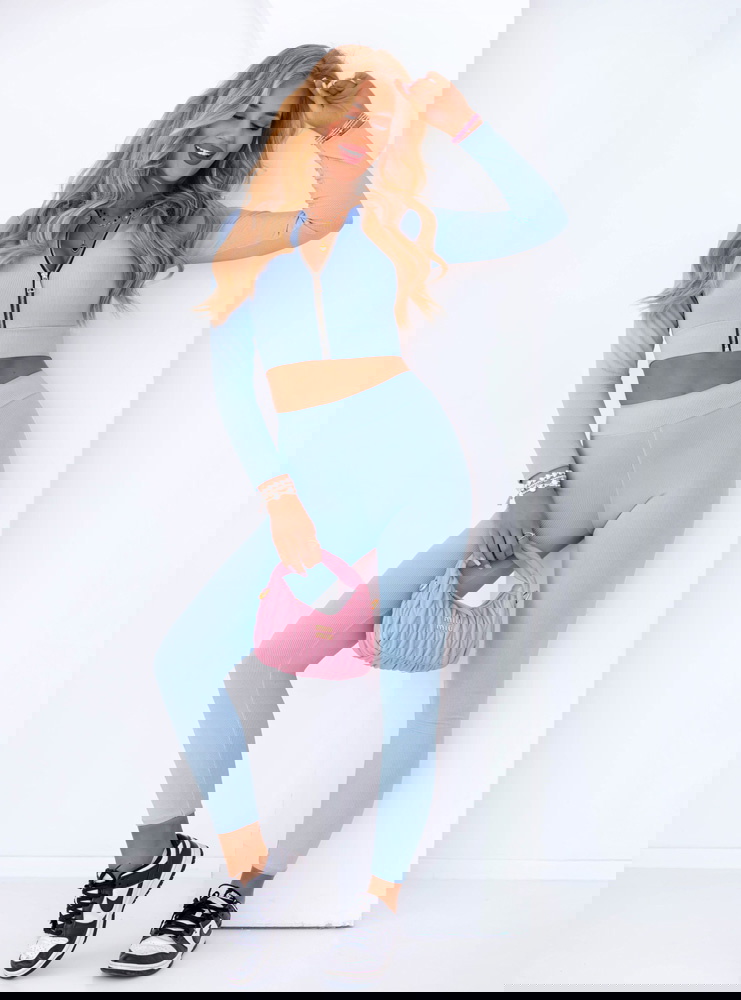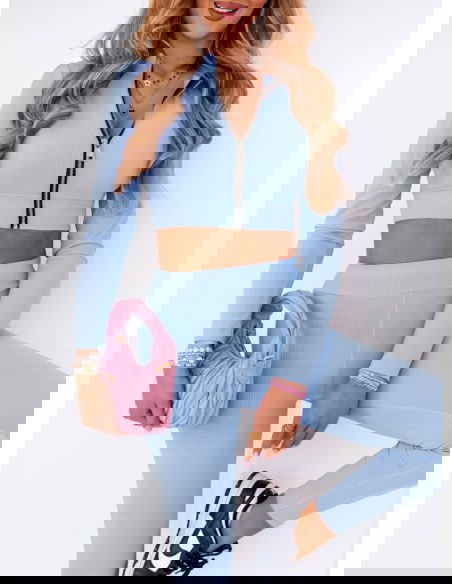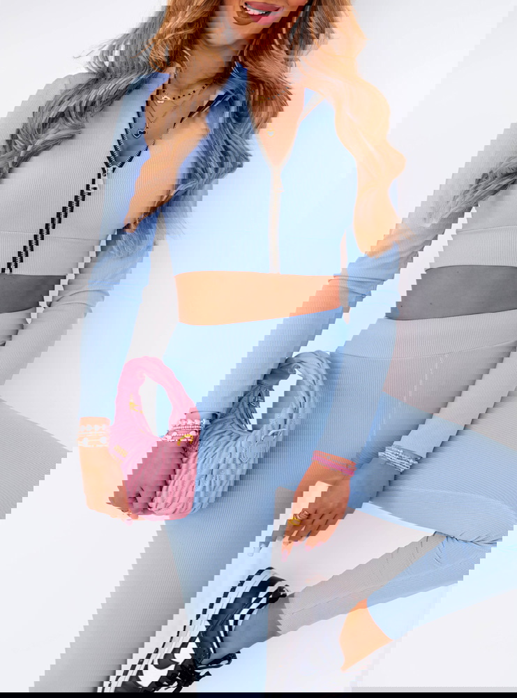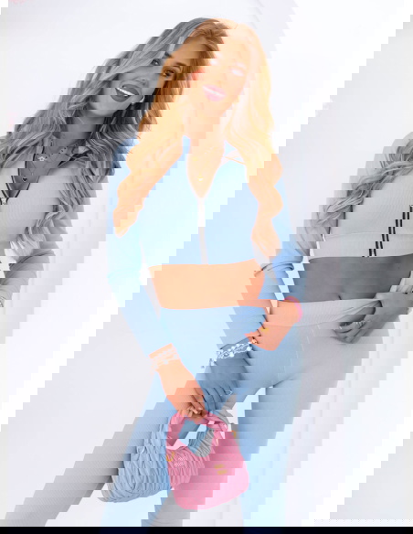 Błękitny prążkowany komplet krótka bluza i spodnie Soflia to propozycja stworzona z myślą o kobietach, które cenią sobie modny wygląd i wygodę w jednym. To stylizacja, która wyróżnia się nie tylko kolorem, ale też fasonem podkreślającym sylwetkę. Komplet idealnie sprawdza się na co dzień, gdy chcesz wyglądać stylowo bez większego wysiłku. Krótka bluza z zamkiem dodaje całości sportowego, ale kobiecego charakteru. Dopasowane spodnie pięknie modelują nogi, a wysoki stan akcentuje talię. Delikatny błękit wprowadza świeżość i lekkość, tworząc look, który przyciąga wzrok. Ten zestaw świetnie sprawdzi się w mieście, na spacerze, podczas wyjazdu czy zakupów. Pasuje do sneakersów, torebki typu bagietka i ulubionej biżuterii. To komplet, w którym poczujesz się pewnie i swobodnie przez cały dzień. Jeśli szukasz stylizacji, która robi wrażenie, ale nie krępuje ruchów – właśnie ją znalazłaś!