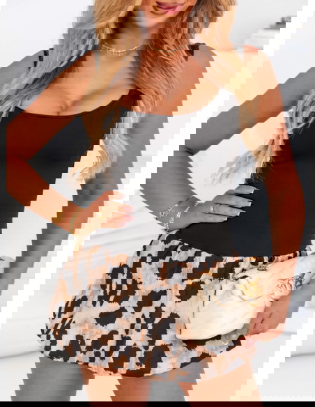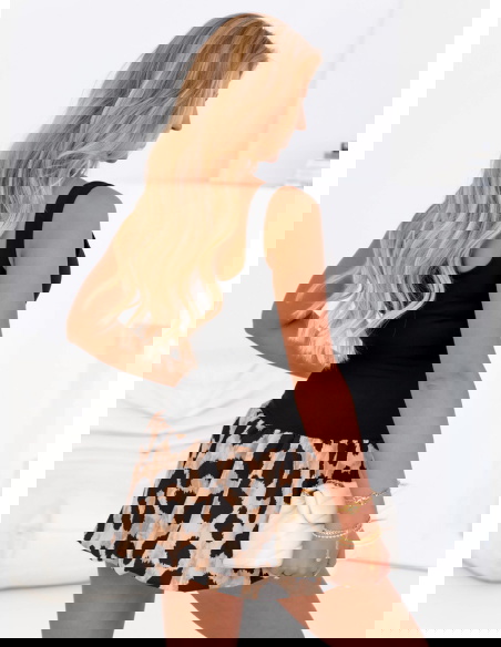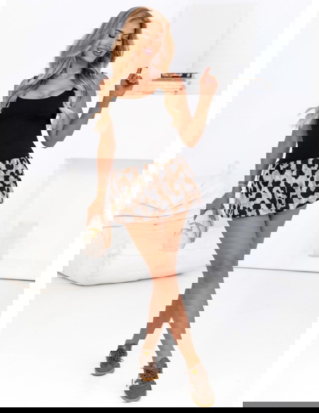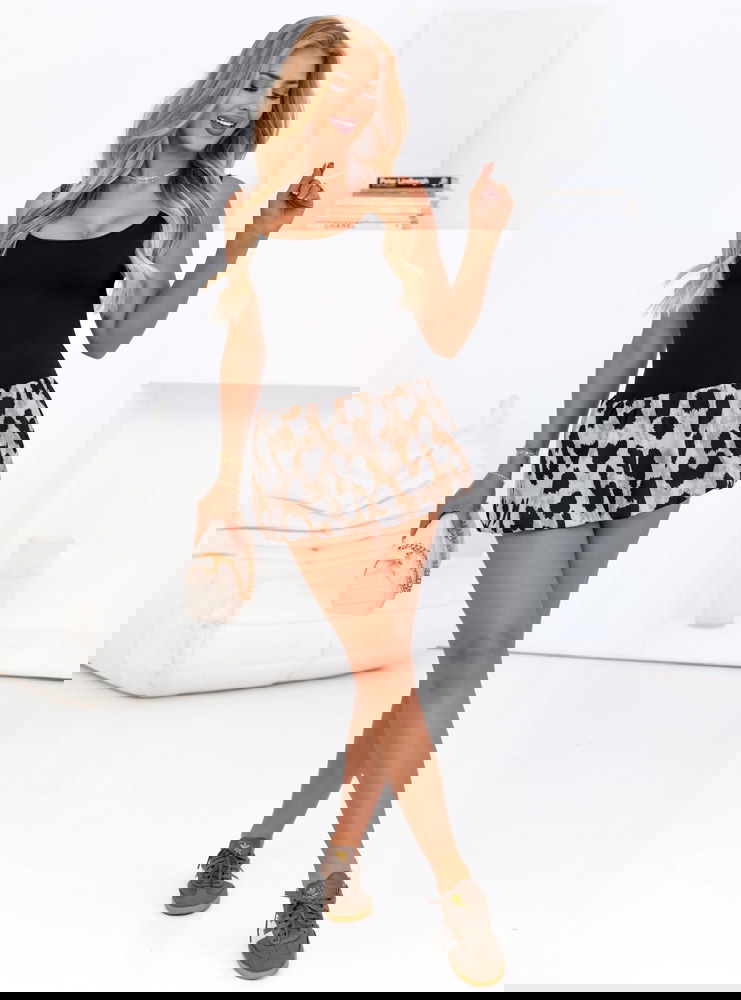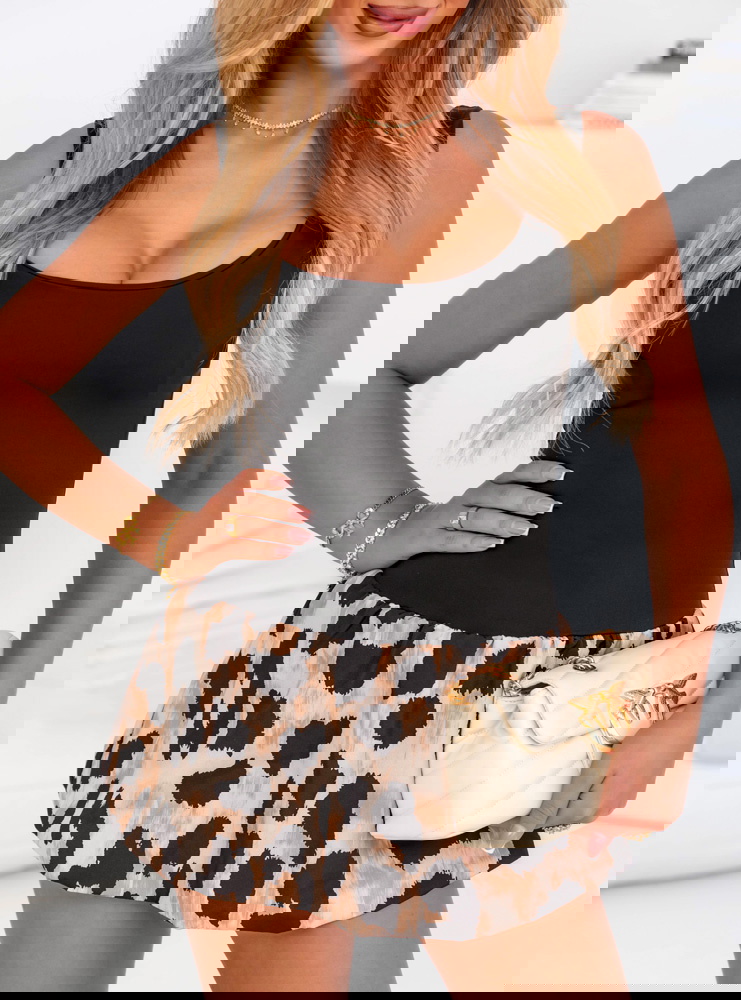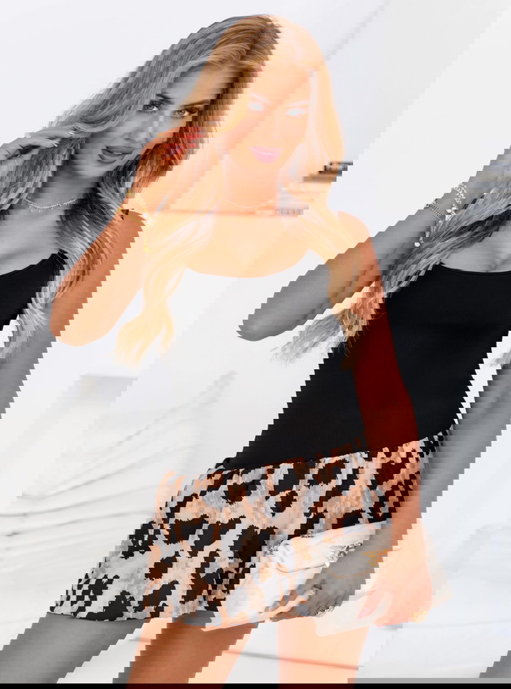 Sukienka mini typu bombka w panterkę Emmalia - wzór 1 to wyjątkowa propozycja dla kobiet, które lubią podkreślać swoją pewność siebie i kobiecość. To model, który od razu przyciąga wzrok dzięki efektownemu wzorowi. Panterkowy dół w połączeniu z gładką, czarną górą tworzy stylizację z pazurem, ale nadal utrzymaną w dobrym guście. Krój typu bombka dodaje lekkości i delikatnie podkreśla nogi. Góra w fasonie dopasowanego topu pięknie eksponuje ramiona i dekolt. Sukienka jest przy tym bardzo wygodna i zapewnia swobodę ruchów. To idealne rozwiązanie na cieplejsze dni, kiedy chcesz wyglądać stylowo bez zbędnego wysiłku. Dzięki wyrazistemu dołowi i klasycznej górze, nie potrzebujesz wielu dodatków – sama sukienka robi efekt „wow”. Idealnie sprawdzi się zarówno solo, jak i w towarzystwie ramoneski lub jeansowej kurtki. To sukienka, która daje mocny stylowy akcent i sprawia, że wyróżniasz się w tłumie.