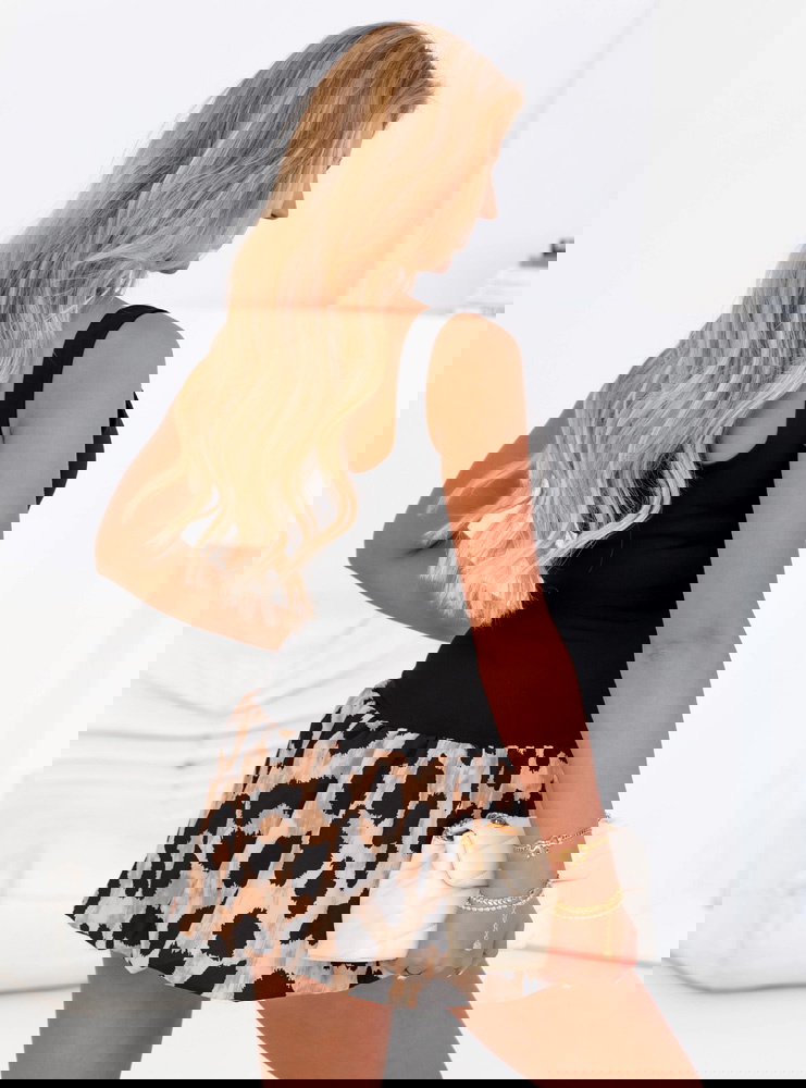 Sukienka mini typu bombka w panterkę Emmalia - wzór 1 to świetna opcja na letnie wyjścia, imprezy i spotkania z przyjaciółmi. Sprawdzi się także na randkę lub wieczór na mieście, gdy chcesz wyglądać zjawiskowo.