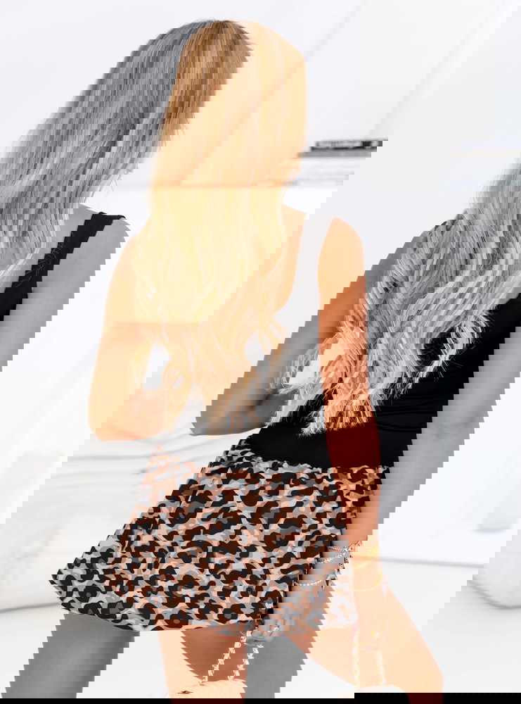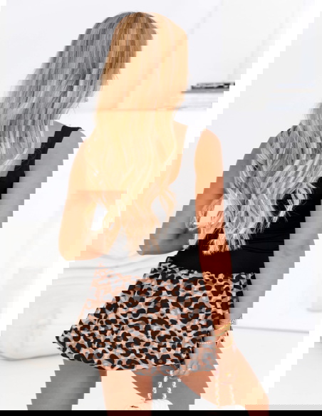 Sukienka mini typu bombka w panterkę Emmalia - wzór 4 doskonała na wieczorne wyjścia, imprezy, randki lub stylowe eventy. Świetnie sprawdzi się też podczas wakacyjnych wieczorów czy koktajlowych spotkań.