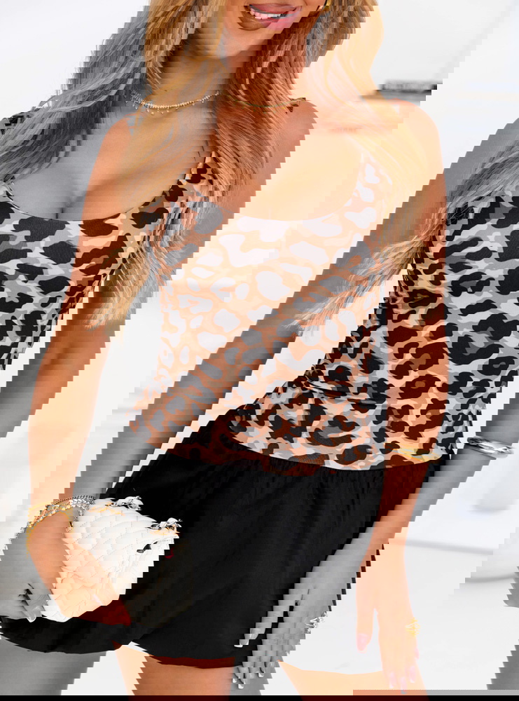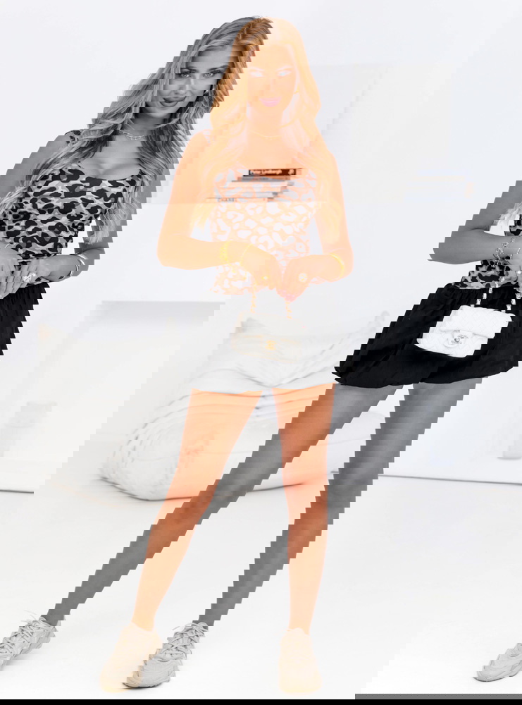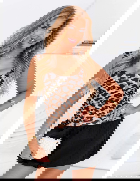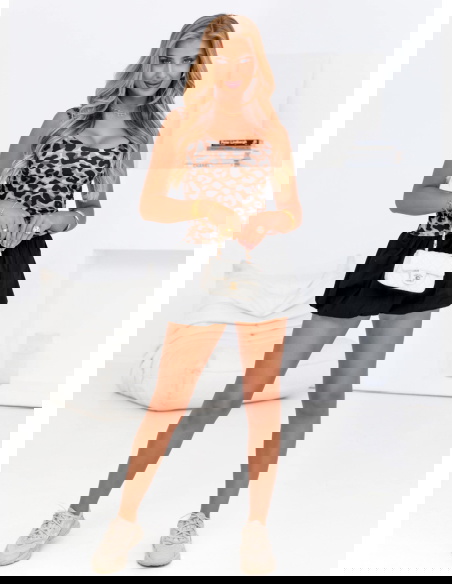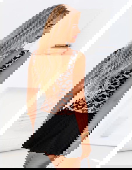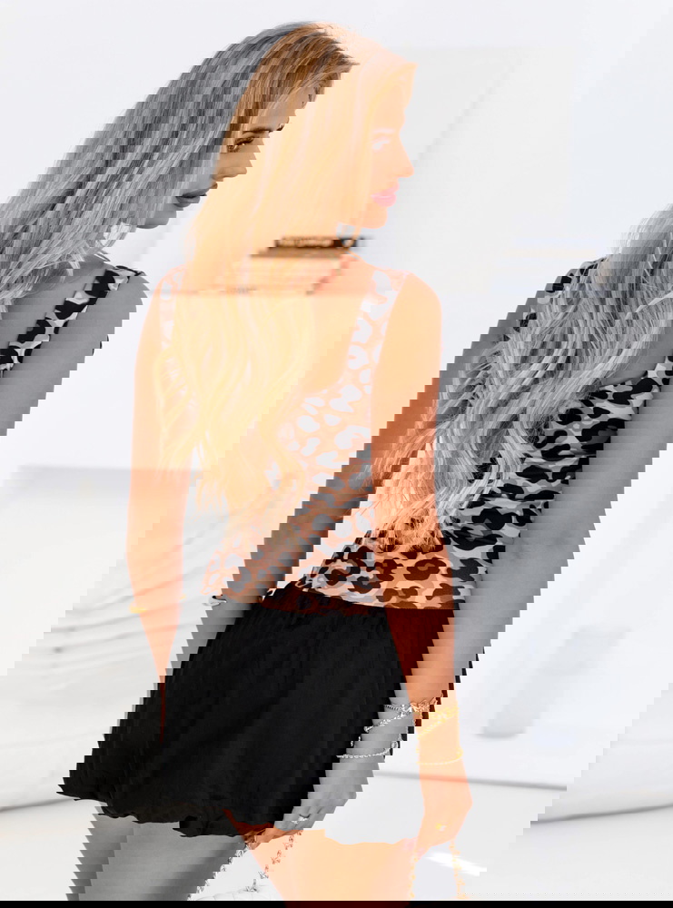 Sukienka mini typu bombka w panterkę Sabinne - wzór 4 to nowoczesne połączenie klasyki z odrobiną modowego szaleństwa. Panterkowa góra w dopasowanym kroju subtelnie eksponuje sylwetkę i przyciąga spojrzenia. Dzięki głębokiemu dekoltowi całość nabiera lekko zmysłowego charakteru, ale wciąż pozostaje elegancka. Rozkloszowany czarny dół w stylu bombki wprowadza lekkość i swobodę, idealnie kontrastując z wyrazistą górą. To świetny wybór dla kobiet, które lubią łączyć odważniejsze elementy z klasycznymi rozwiązaniami. Sukienka dobrze dopasowuje się do figury i zapewnia komfort przez cały dzień lub wieczór. Stylowy design sprawia, że nie potrzebujesz wielu dodatków – ta kreacja broni się sama. Świetnie wygląda zarówno w wersji ze szpilkami, jak i bardziej casualowej stylizacji z sandałkami. Model ten to idealne rozwiązanie na sezon wiosenno-letni, kiedy liczy się lekkość i styl. Jeśli szukasz czegoś, co wyróżni Cię z tłumu, właśnie znalazłaś!