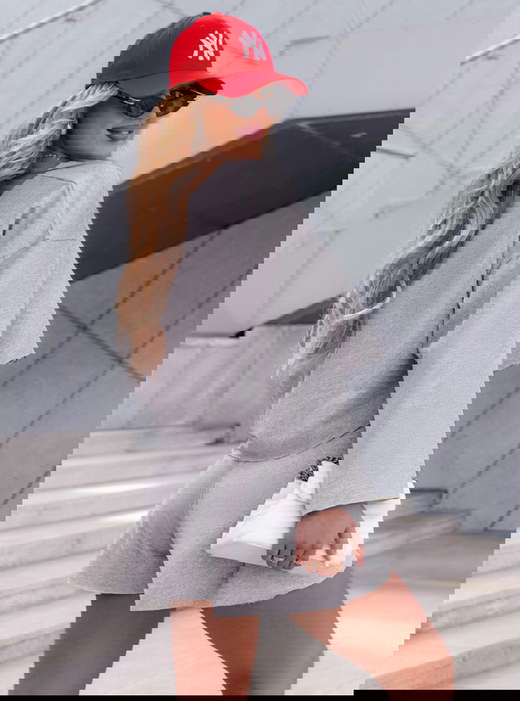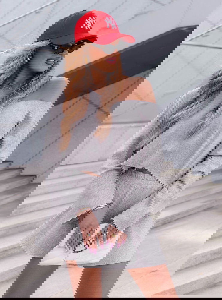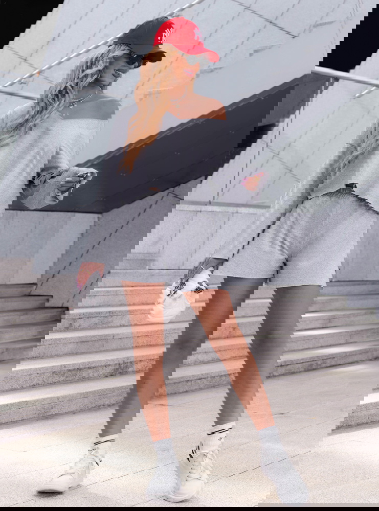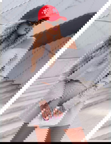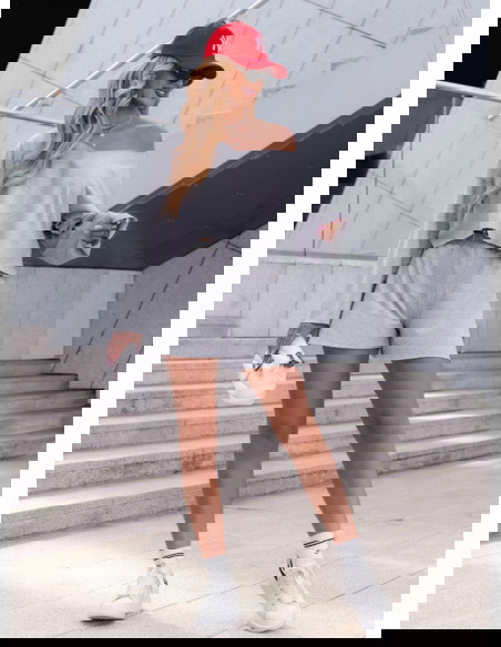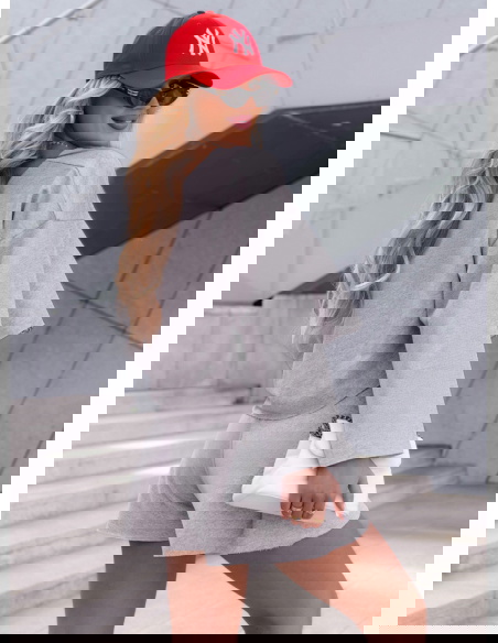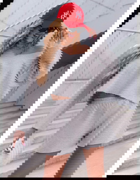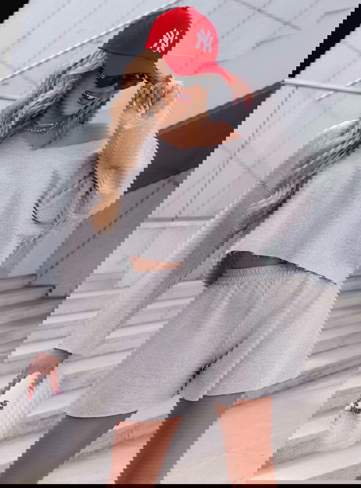 Szary dresowy komplet bluzka i spodenki Deveny to kwintesencja wygodnego stylu, który nie rezygnuje z kobiecego charakteru. Luźna bluzka z długim rękawem subtelnie eksponuje dekolt i nadaje całości lekko zmysłowego wyrazu. Krótszy krój bluzki pięknie współgra z wysokim stanem spodenek, tworząc harmonijny i nowoczesny zestaw. Spodenki są lekkie, wygodne i mają elastyczną talię, co daje pełną swobodę ruchów. Utrzymany w jasnoszarej kolorystyce komplet jest uniwersalny i ponadczasowy – pasuje praktycznie do wszystkiego. To stylizacja typu „na luzie”, ale w modnym wydaniu. Świetnie sprawdzi się nie tylko w domowym zaciszu, ale i na mieście, spacerze czy podczas weekendowego wypadu. Można go łatwo wystylizować z trampkami, czapką z daszkiem, a nawet bardziej eleganckimi dodatkami. Idealny do tworzenia szybkich, ale przemyślanych outfitów. Jeśli lubisz połączenie komfortu z subtelną kobiecością – ten komplet będzie Twoim hitem.