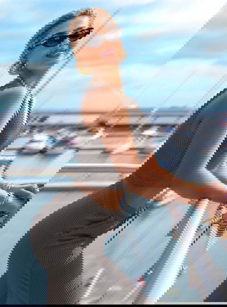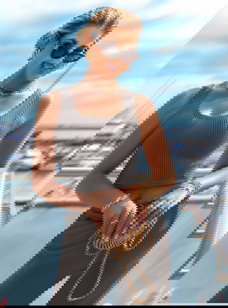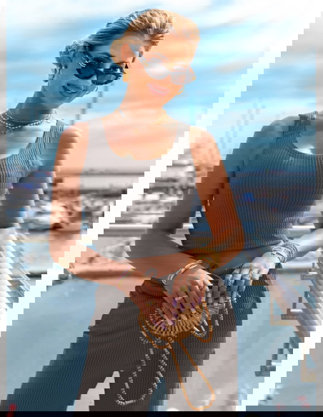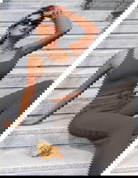 Grafitowy komplet top i szerokie spodnie Suellen to stylowa i wygodna propozycja, która świetnie sprawdzi się na co dzień. Dopasowany top pięknie podkreśla górną część sylwetki, a lekko zaokrąglony dekolt nadaje mu kobiecego uroku. Spodnie z szeroką nogawką i wiązaniem w pasie zapewniają komfort oraz optycznie wydłużają nogi. Całość utrzymana jest w głębokim grafitowym odcieniu – eleganckim, ale niebanalnym. Prążkowana faktura materiału dodaje stylizacji lekkości i modnego sznytu. Komplet można nosić jako gotowy outfit lub zestawiać poszczególne elementy z innymi ubraniami. To idealny zestaw, jeśli zależy Ci na luzie i stylowym wyglądzie w jednym. W połączeniu z trampkami lub klapkami tworzy idealny look na lato, a z ramoneską zyskuje bardziej wyrazisty charakter. Minimalizm kroju sprawia, że świetnie komponuje się z różnymi dodatkami – zarówno złotymi, jak i bardziej neutralnymi. Jeśli szukasz czegoś uniwersalnego, co wygląda dobrze i daje pełną swobodę – ten komplet będzie Twoim ulubieńcem.