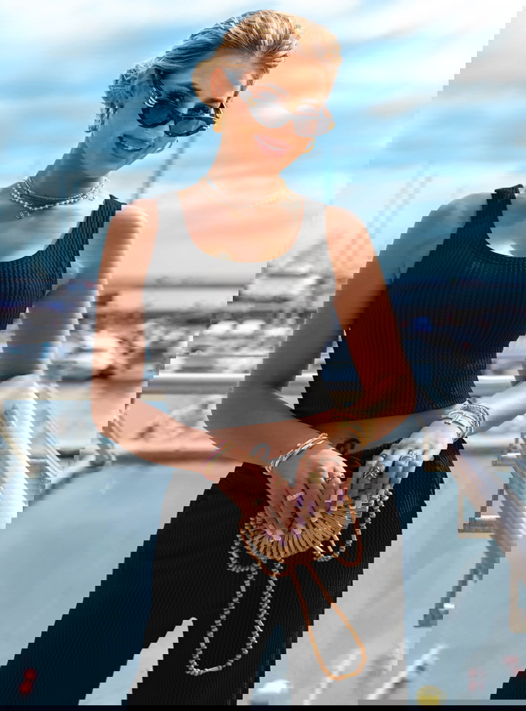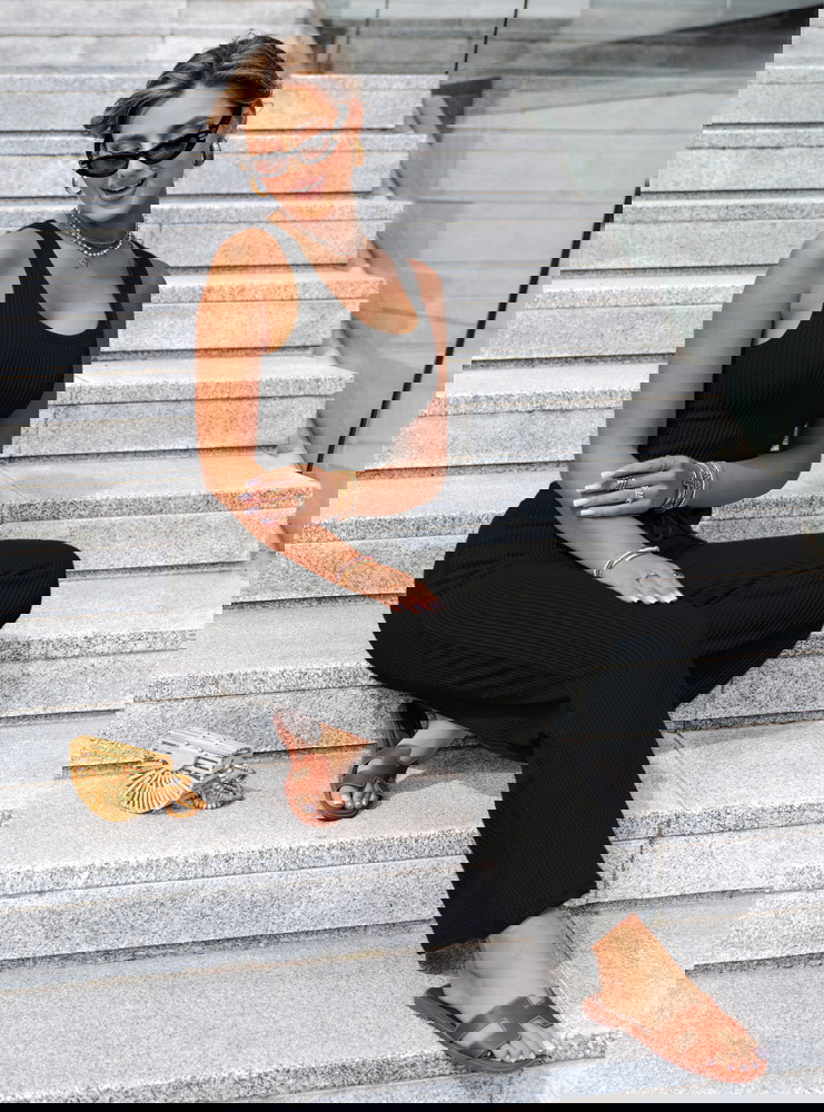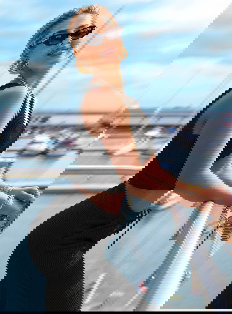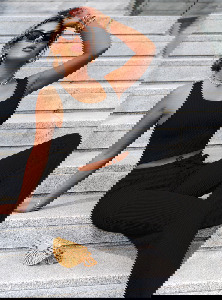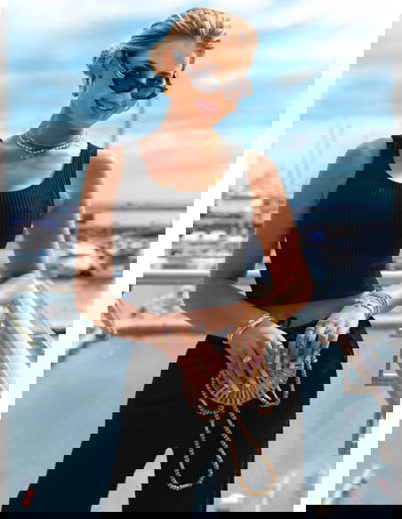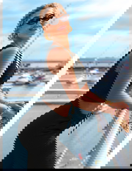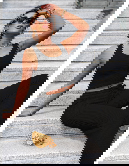 Czarny komplet top i szerokie spodnie Suellen to klasyka w nowoczesnym, prążkowanym wydaniu. Elegancki, minimalistyczny fason sprawia, że zestaw wygląda stylowo bez żadnego wysiłku. Dopasowany top z szerokimi ramiączkami pięknie podkreśla ramiona i talię, jednocześnie zapewniając wygodę przez cały dzień. Spodnie z wysokim stanem i lekko rozszerzanymi nogawkami wysmuklają sylwetkę i dodają jej proporcji. Prążkowana faktura nadaje całości modowego charakteru i lekko sportowego sznytu. Czarny kolor dodaje klasy i pasuje do wszystkiego – to baza, która nigdy nie wychodzi z mody. Możesz nosić komplet razem albo rozdzielić go, tworząc dziesiątki innych stylizacji. Idealnie sprawdzi się zarówno na mieście, jak i podczas podróży czy leniwego weekendu. Wystarczy dobrać dodatki, by przejść z casualu do wersji bardziej chic. To komplet, który pokochasz za jego uniwersalność i ponadczasowy look.