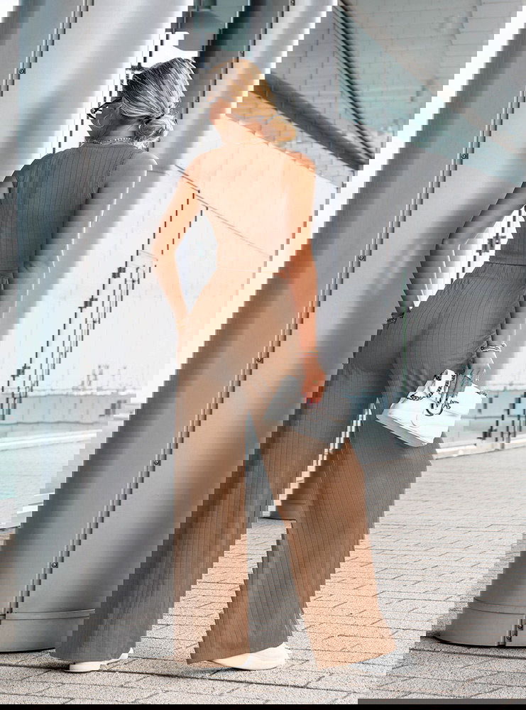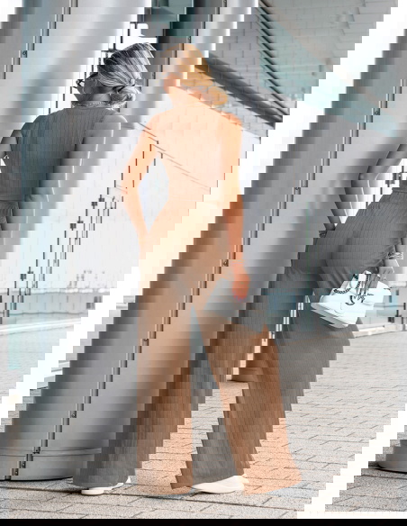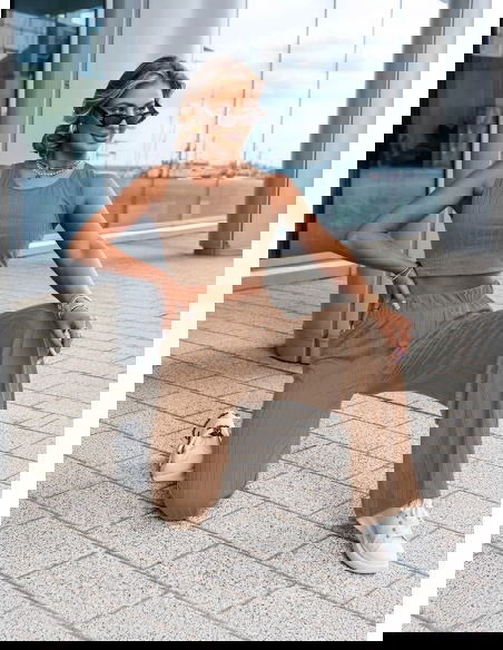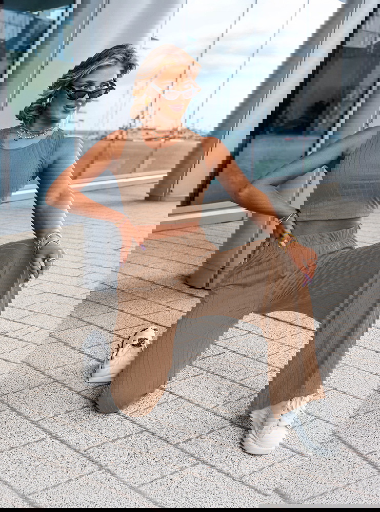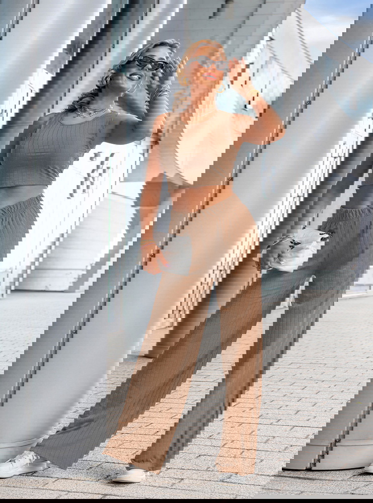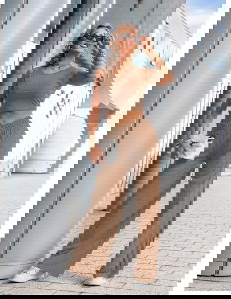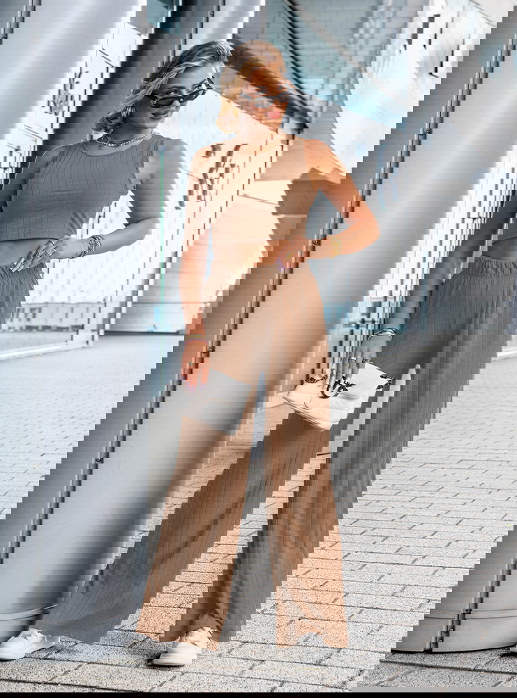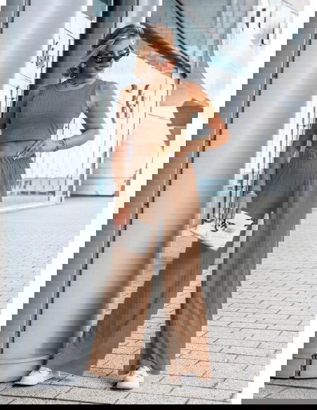 Komplet top i spodnie Darrian - mocha mousse to stylowa propozycja dla kobiet, które cenią wygodę i nowoczesny wygląd w codziennych stylizacjach. Ten zestaw to idealne połączenie minimalizmu z trendami – prosty krój, dopasowany top i szerokie spodnie tworzą razem zgrany duet. Kolor mocha mousse to ciepły, karmelowy odcień, który pięknie komponuje się z opaloną skórą i świetnie wygląda o każdej porze roku. Krótki top bez rękawów eksponuje ramiona i talię, a przy tym dobrze układa się na sylwetce. Szerokie, luźne spodnie z wysokim stanem i elastyczną talią podkreślają kobiecą sylwetkę i zapewniają swobodę ruchów. Subtelna, prążkowana struktura materiału dodaje całości modowego charakteru i sprawia, że komplet wygląda bardzo współcześnie. To zestaw, który założysz zarówno na spacer, jak i na spotkanie z przyjaciółką czy weekendowy wypad. Możesz nosić go razem lub rozdzielić – każdy element świetnie sprawdzi się również solo. Prosty fason daje mnóstwo możliwości stylizacji – z trampkami, klapkami, a nawet z marynarką. To zestaw, który pozwoli Ci wyglądać modnie, ale bez wysiłku.