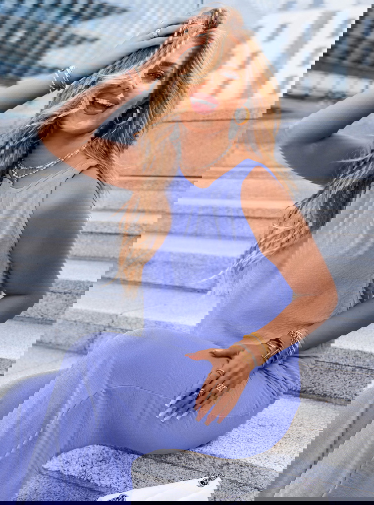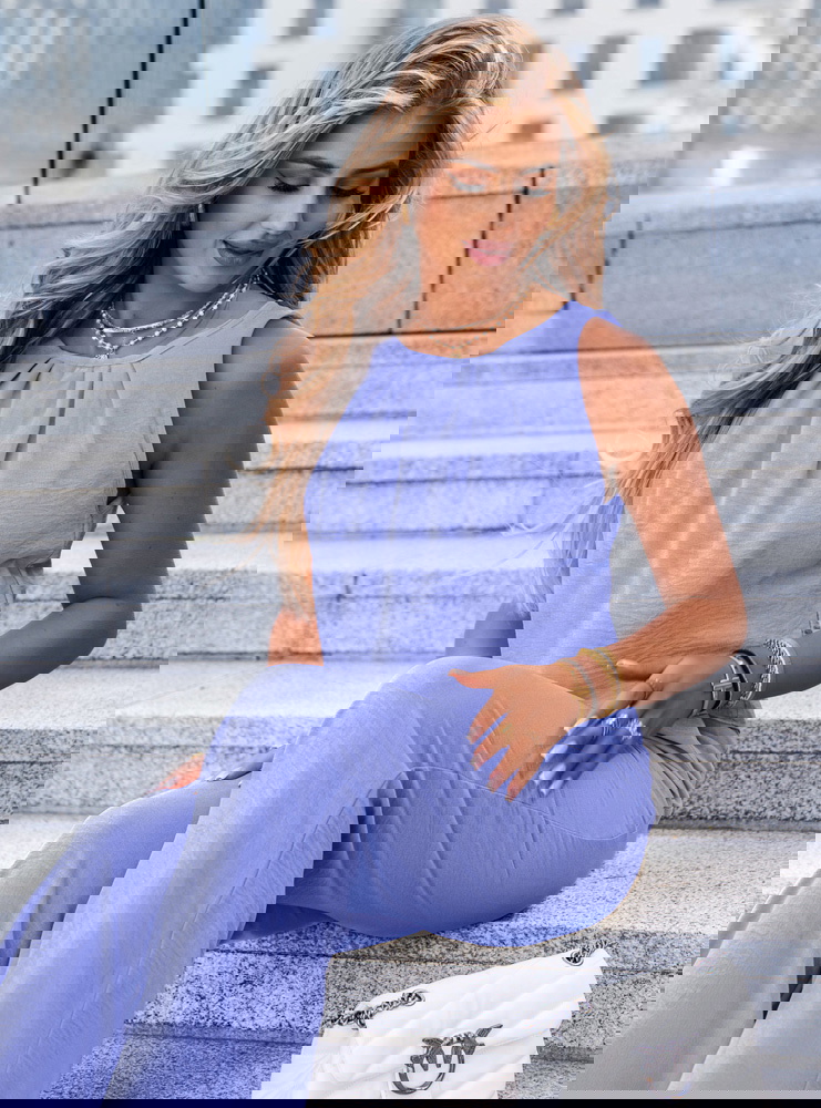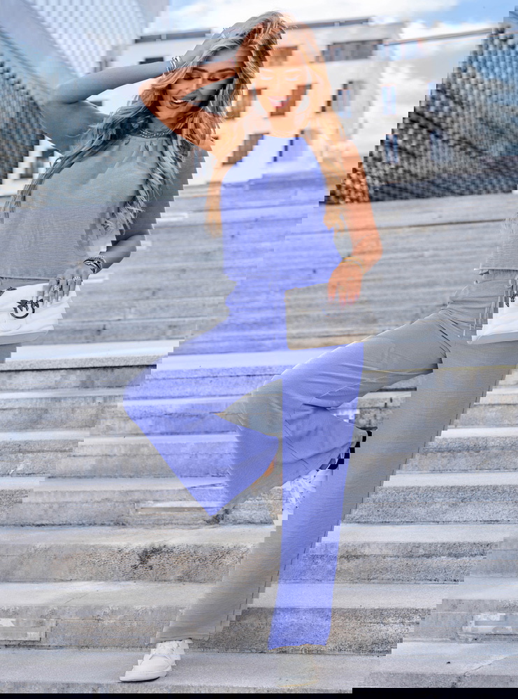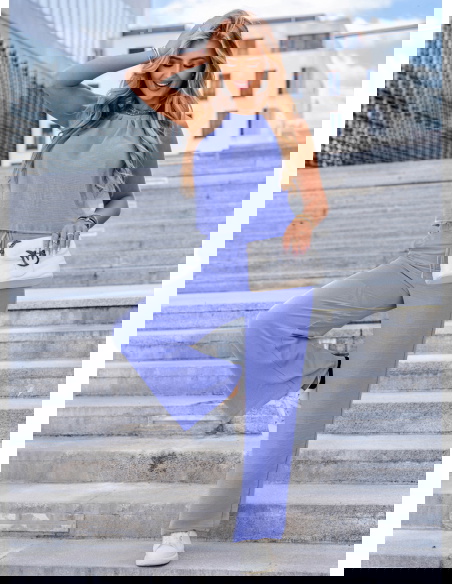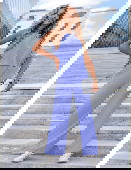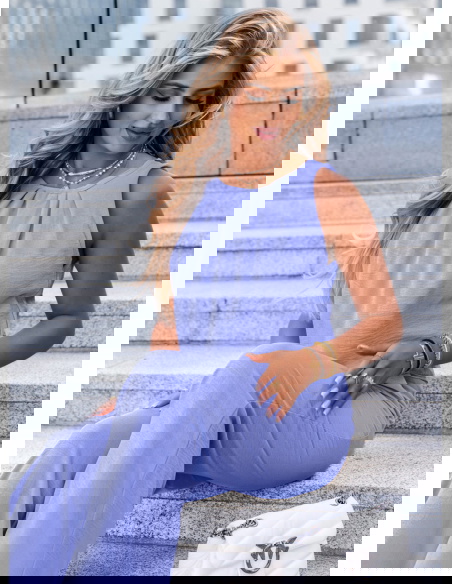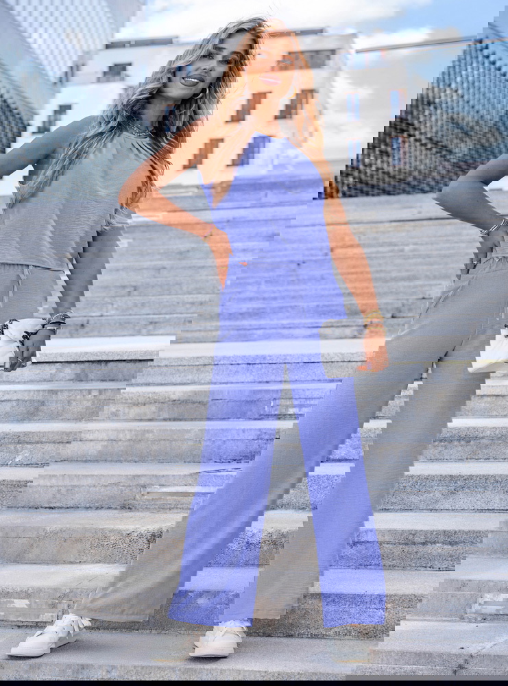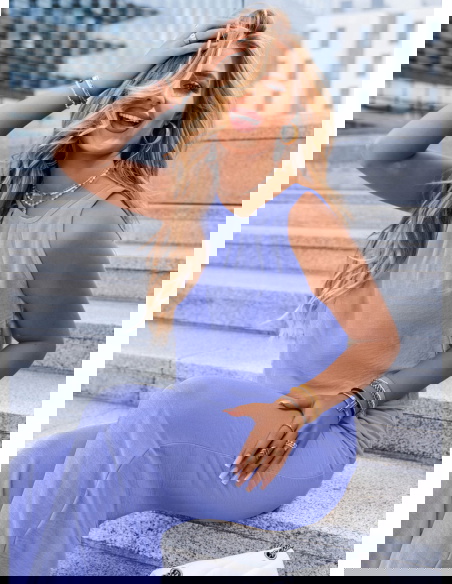 Niebieski komplet bluzka i spodnie Deiene to stylowa i funkcjonalna propozycja dla kobiet ceniących wygodę w nowoczesnym wydaniu. Delikatny odcień niebieskiego dodaje świeżości i sprawia, że całość wygląda lekko i dziewczęco. Bezrękawnik z luźnym krojem i lekko marszczonym dekoltem prezentuje się bardzo swobodnie, a jednocześnie kobieco. Spodnie o szerokich nogawkach i elastycznej talii z wiązaniem pięknie układają się na sylwetce i gwarantują pełną swobodę ruchów. Cały zestaw tworzy efekt lekkości i komfortu – bez kompromisów w stylu. To idealna baza dla codziennych stylizacji w ciepłe dni. Dzięki prostej formie i subtelnemu kolorowi łatwo dopasujesz do niego różne dodatki. Komplet świetnie sprawdzi się zarówno w wersji casualowej, jak i bardziej sportowej. To wybór, który nie tylko dobrze wygląda, ale również doskonale się nosi. Idealny dla kobiet, które lubią wyglądać stylowo bez wysiłku.