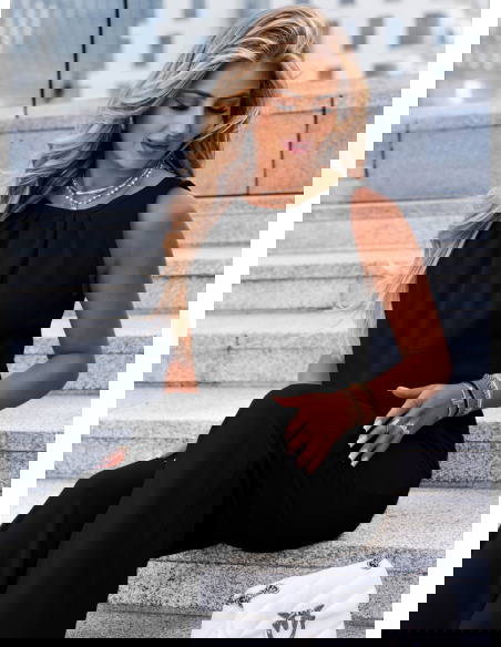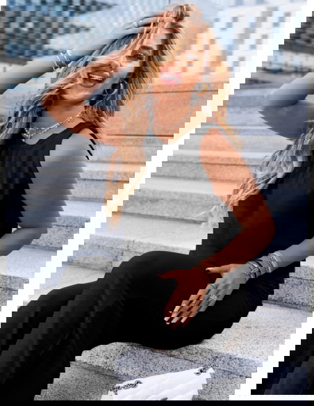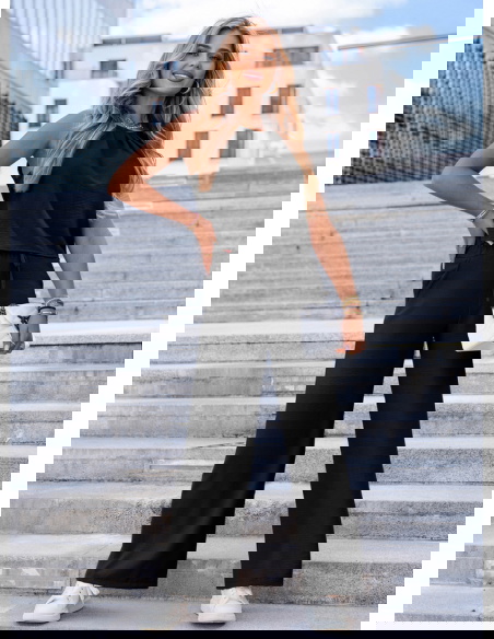 Czarny komplet bluzka i spodnie Deiene to ponadczasowy wybór, który łączy wygodę i styl w jednej, niezwykle uniwersalnej formie. Luźna bluzka bez rękawów zapewnia komfort noszenia i wygląda nowocześnie, nie tracąc przy tym kobiecego charakteru. Szerokie spodnie z elastycznym pasem pięknie układają się na sylwetce i optycznie ją wydłużają. Całość utrzymana jest w głębokim, klasycznym odcieniu czerni, który zawsze prezentuje się elegancko i szykownie. To zestaw, który możesz założyć zarówno na co dzień, jak i na wieczorne wyjście – wystarczy zmienić dodatki. Minimalistyczny krój sprawia, że komplet daje mnóstwo możliwości stylizacyjnych. Dobrze komponuje się zarówno z trampkami, jak i sandałkami czy butami na obcasie. To wybór, który sprawdzi się przez cały rok – wiosną, latem, a nawet w cieplejsze jesienne dni. Bluzkę i spodnie można nosić osobno, dzięki czemu zestaw zyskuje dodatkową wartość użytkową. Jeśli szukasz uniwersalnego, a przy tym stylowego kompletu – ten model spełni Twoje oczekiwania.