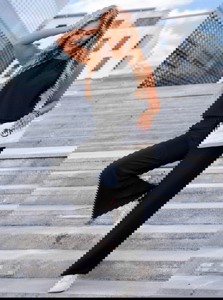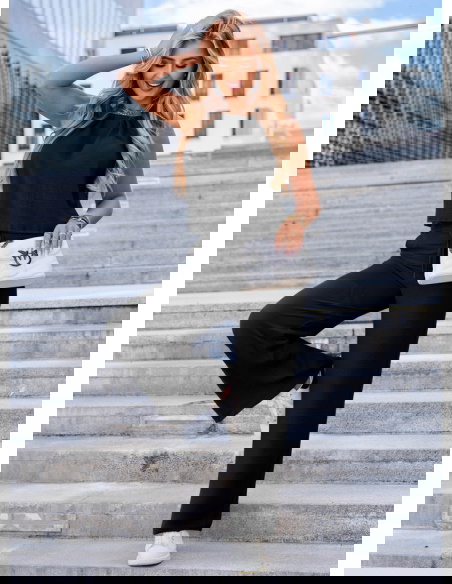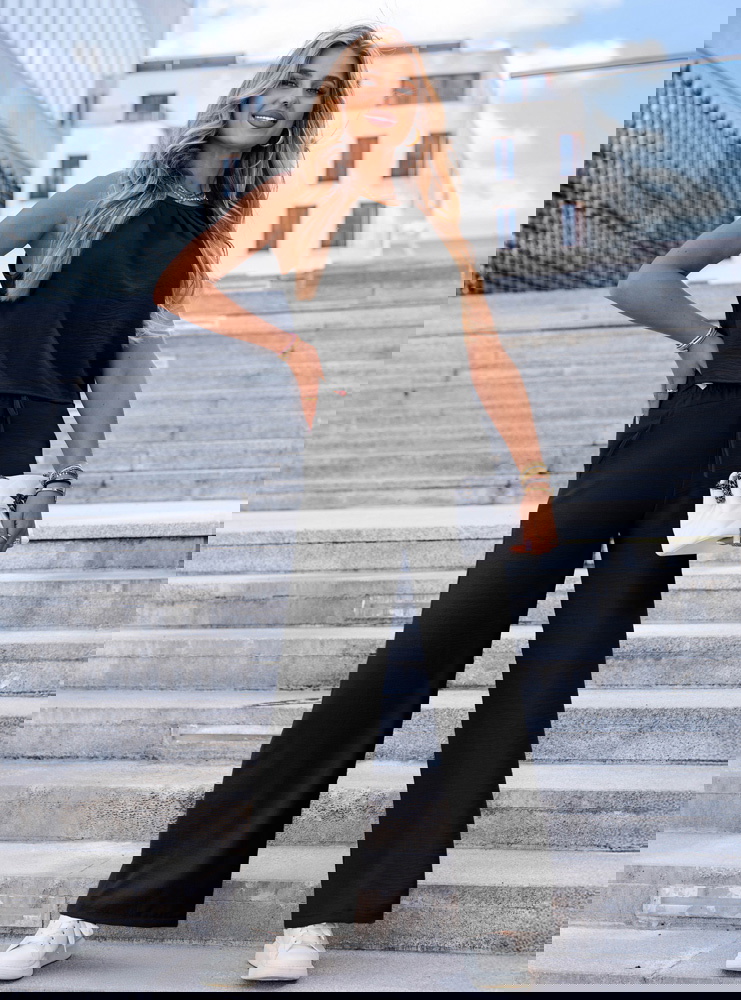 Czarny komplet bluzka i spodnie Deiene sprawdzi się idealnie na codzienne wyjścia, spotkania z przyjaciółmi, wakacyjne spacery czy nawet nieformalne spotkania w pracy. Dzięki klasycznemu kolorowi i krojowi łatwo wystylizować go zarówno w wersji sportowej, jak i eleganckiej.