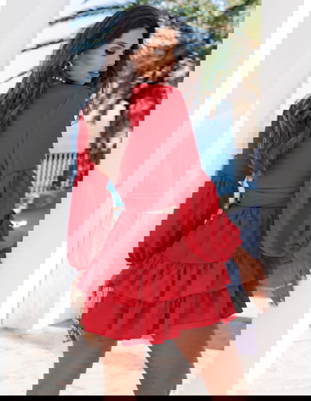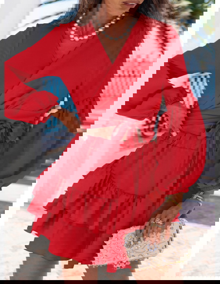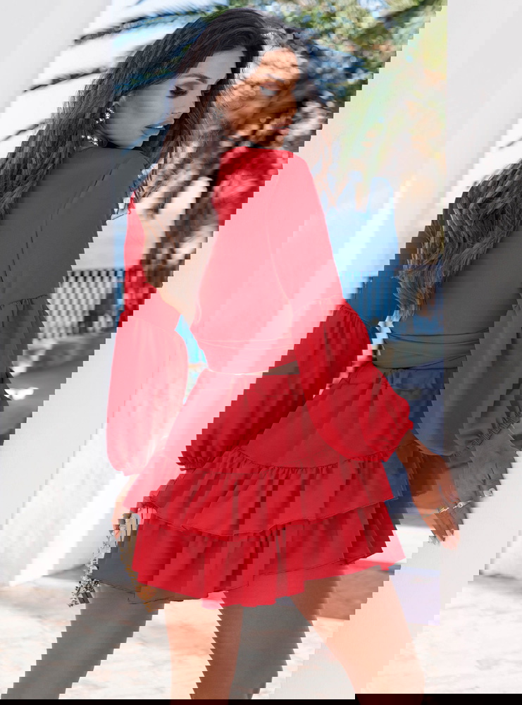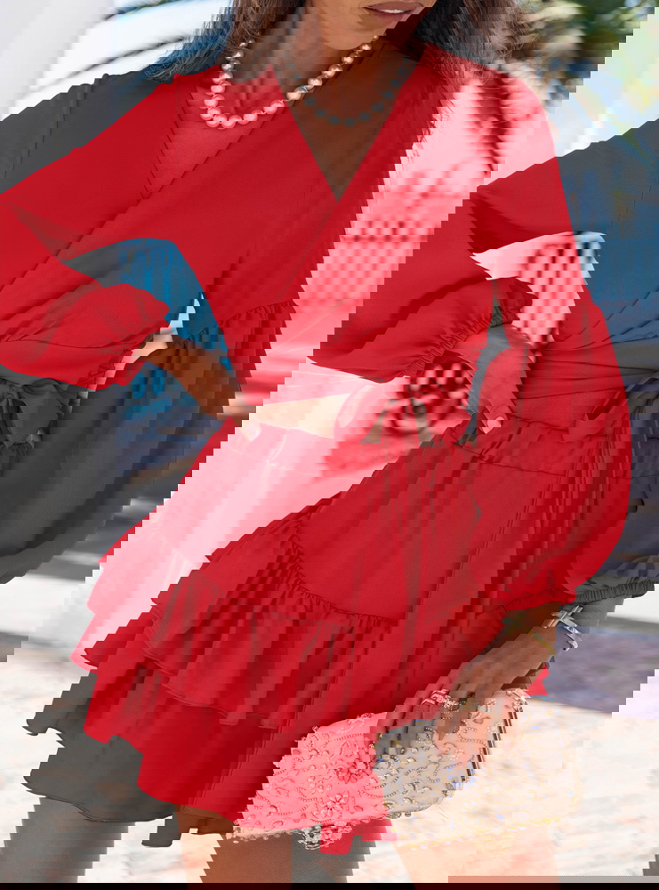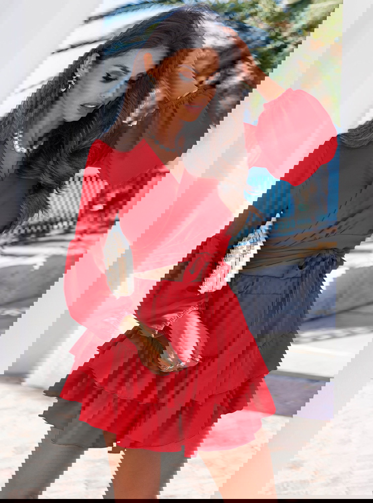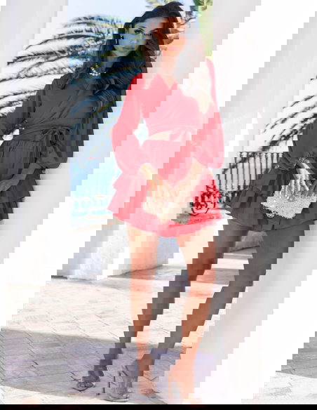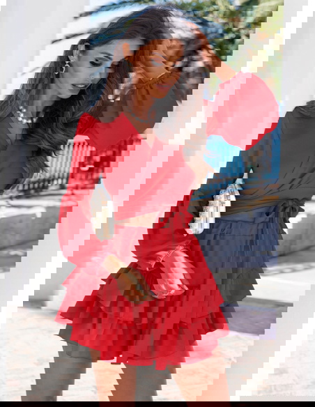 Malinowy komplet bluzka z wiązaniem i spódnico - spodenki Brunette to wyjątkowo kobieca propozycja, która łączy romantyzm z nowoczesnym stylem. Bluzka z efektownym przekładanym wiązaniem w talii pięknie podkreśla sylwetkę i eksponuje talię w delikatny, zmysłowy sposób. Bufiaste rękawy zakończone gumką dodają całości lekkości i uroku. Spódnico-spodenki z falbanami wyglądają jak rozkloszowana mini, ale dzięki wszytym szortom zapewniają pełną swobodę i komfort noszenia. Intensywny malinowy kolor przyciąga spojrzenia i dodaje energii każdej stylizacji. To zestaw, który idealnie sprawdzi się latem, gdy chcesz wyglądać stylowo i czuć się swobodnie. Stylizacja jest bardzo efektowna, ale nieprzekombinowana – wystarczy dodać delikatną biżuterię i ulubione sandałki. Oba elementy można również nosić osobno, co zwiększa możliwości ich wykorzystania. Świetnie łączy się z beżowymi, złotymi i białymi dodatkami. Ten komplet to idealne połączenie elegancji, luzu i kobiecego wdzięku.