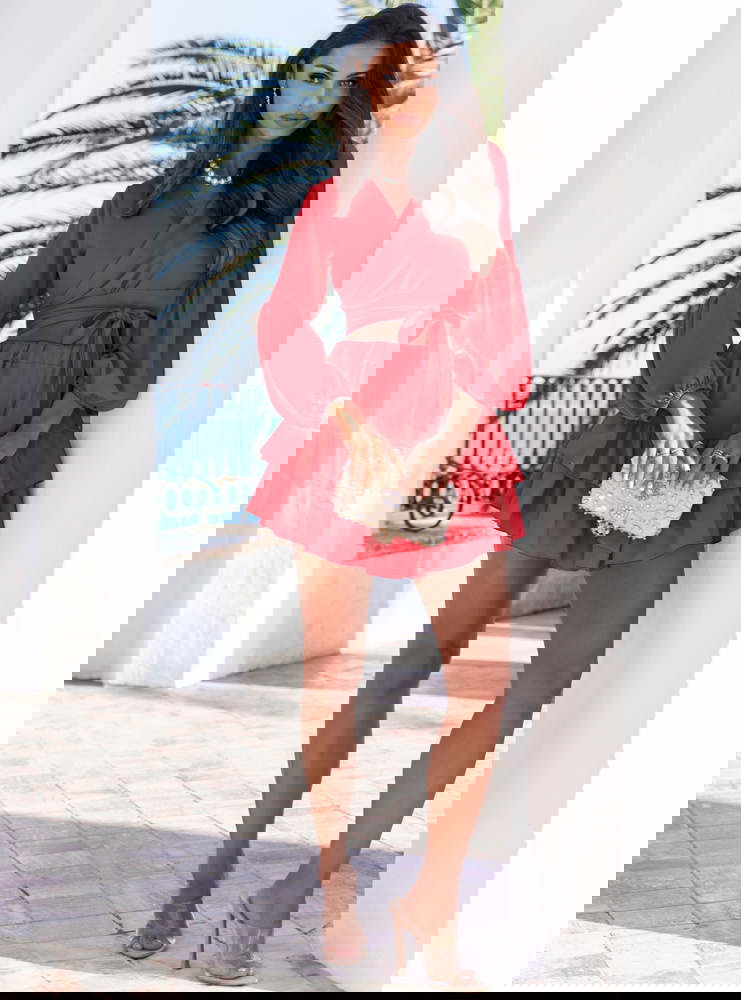 Malinowy komplet bluzka z wiązaniem i spódnico - spodenki Brunette świetnie sprawdzi się na letnie wyjścia, wakacyjne spacery, randki czy spotkania z przyjaciółkami. Jest idealny na urlop – lekki, wygodny i efektowny.
