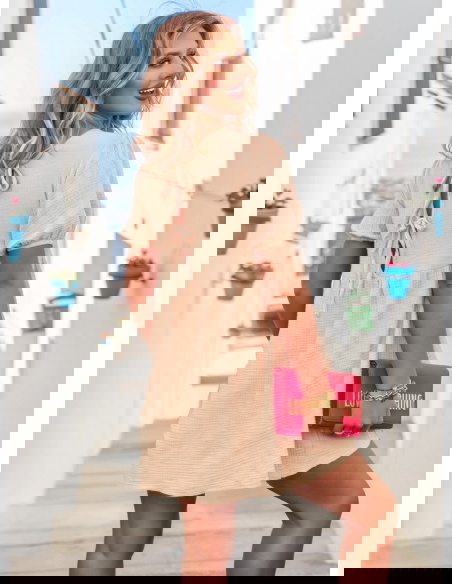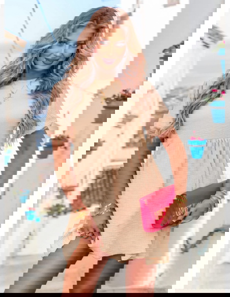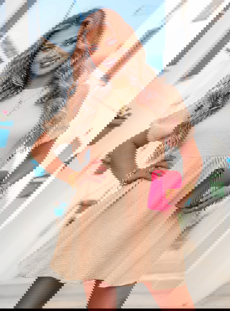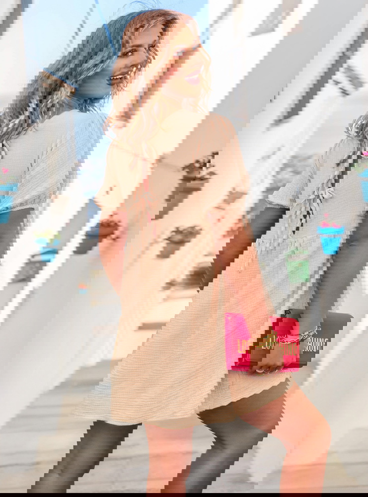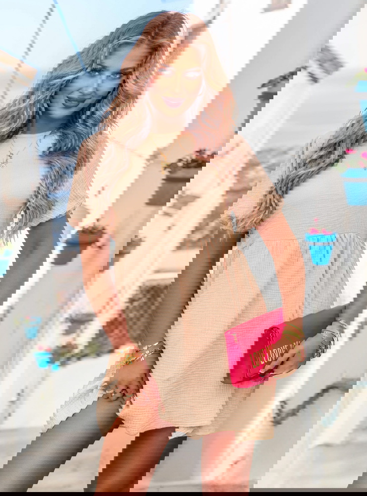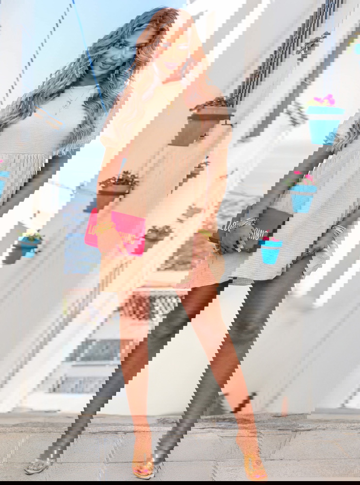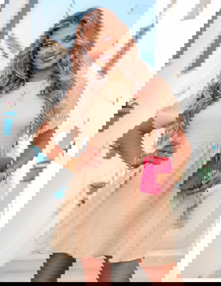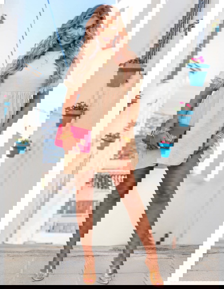 Beżowa muślinowa sukienka mini Cenaida to kwintesencja letniej swobody i dziewczęcego uroku. Model z kolekcji Costa Del Amor został stworzony z myślą o kobietach, które w modzie cenią przede wszystkim lekkość, prostotę i delikatny styl. Przód sukienki zachwyca minimalistycznym fasonem z lekko podniesioną talią i krótkim rękawkiem o delikatnie zaokrąglonym wykończeniu. Krótszy krój pięknie eksponuje nogi i dodaje figlarności całej sylwetce. Tył sukienki zdobią subtelne wiązania, które nie tylko dodają uroku, ale też pozwalają na lekką regulację dopasowania. Całość prezentuje się niezwykle świeżo, naturalnie i bardzo kobieco – idealnie wpisując się w klimat śródziemnomorskich uliczek, wakacyjnych spacerów czy swobodnych spotkań. Kolor beżowy to uniwersalna baza, która pasuje do każdej karnacji i daje pełną dowolność stylizacji. To sukienka, która nie potrzebuje dodatków, by wyglądać dobrze – ale z odpowiednią torebką i biżuterią potrafi stworzyć naprawdę stylowy efekt.