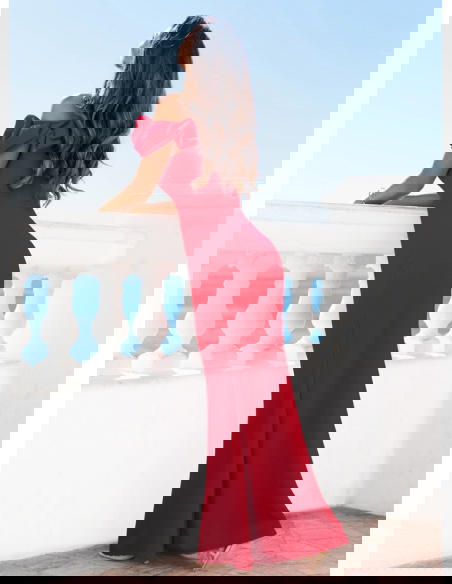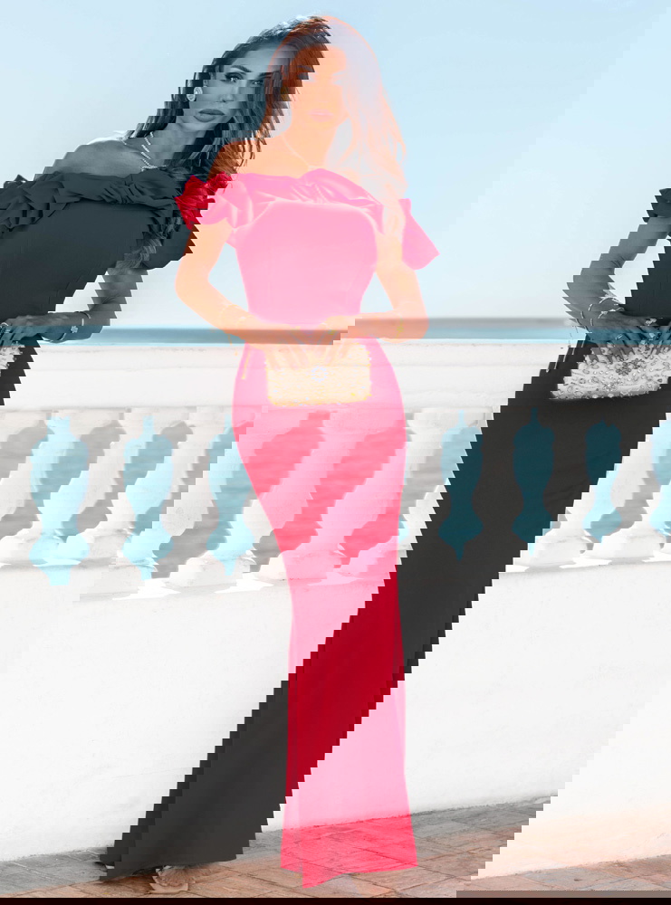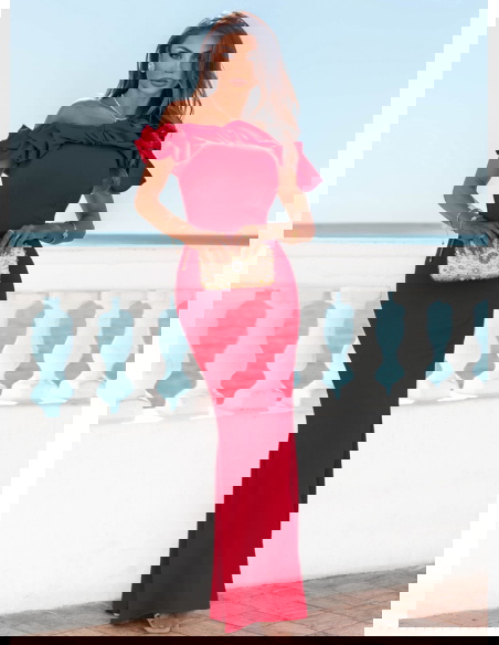 Malinowa długa sukienka typu hiszpanka z falbanką Aranelii jest idealna na wesela, przyjęcia wieczorowe, gale i uroczyste kolacje. Świetna propozycja również na sesję zdjęciową lub elegancki event w letnim klimacie.