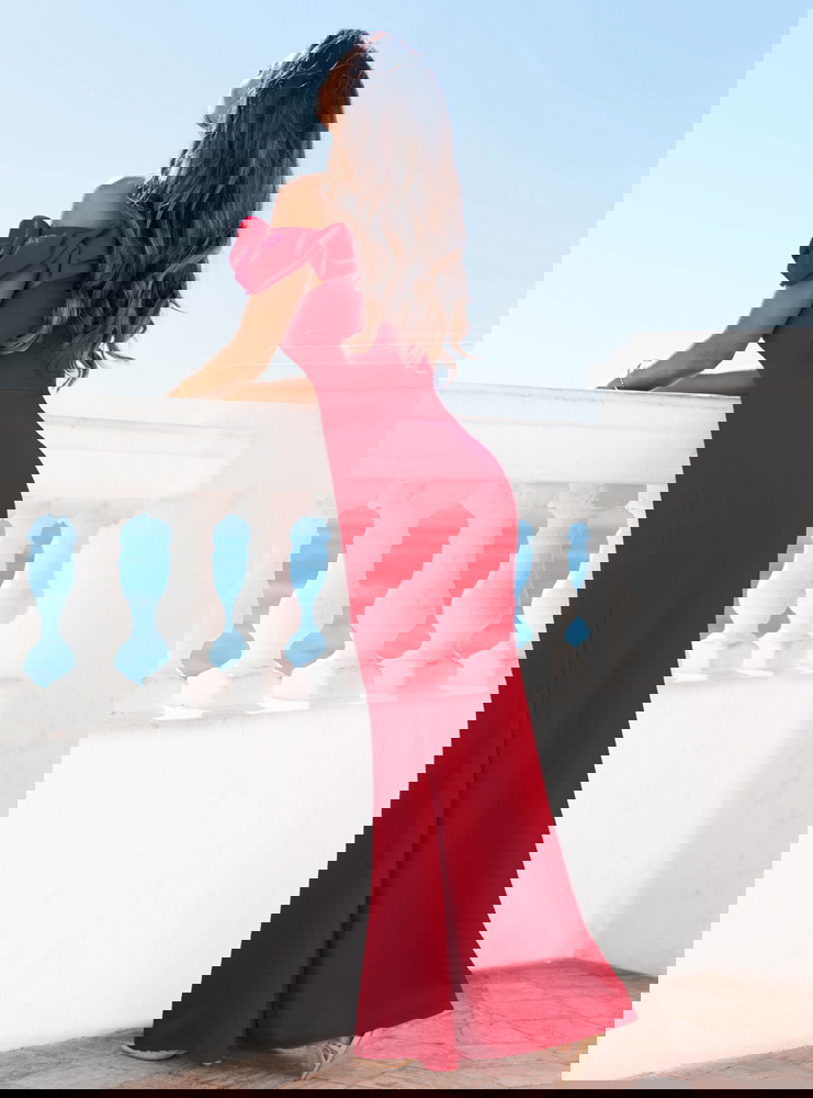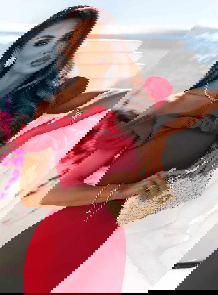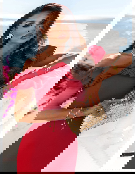 Malinowa długa sukienka typu hiszpanka z falbanką Aranelii to spektakularna propozycja dla kobiet, które kochają klasyczną elegancję z odrobiną śródziemnomorskiego temperamentu. Model z kolekcji Costa Del Amor łączy dopasowany krój z efektownym wykończeniem w postaci opadających ramion i falban, które nadają całości romantycznego i bardzo kobiecego wyrazu. Odsłonięte ramiona subtelnie podkreślają szyję i dekolt, a falbana nadaje sukience lekkości i dynamiki. Długość maxi i wyprofilowana linia talii wysmuklają sylwetkę, tworząc zjawiskową proporcję. Soczysty malinowy odcień to wybór odważny, ale pełen klasy – przyciąga uwagę, ale nie dominuje. To kreacja idealna na przyjęcia, wesela, gale i eleganckie wieczory. Wystarczy niewiele dodatków – sukienka sama w sobie robi wrażenie.