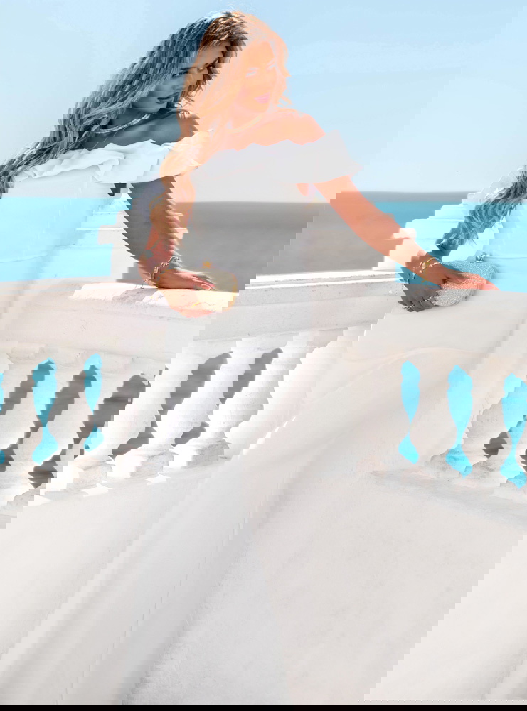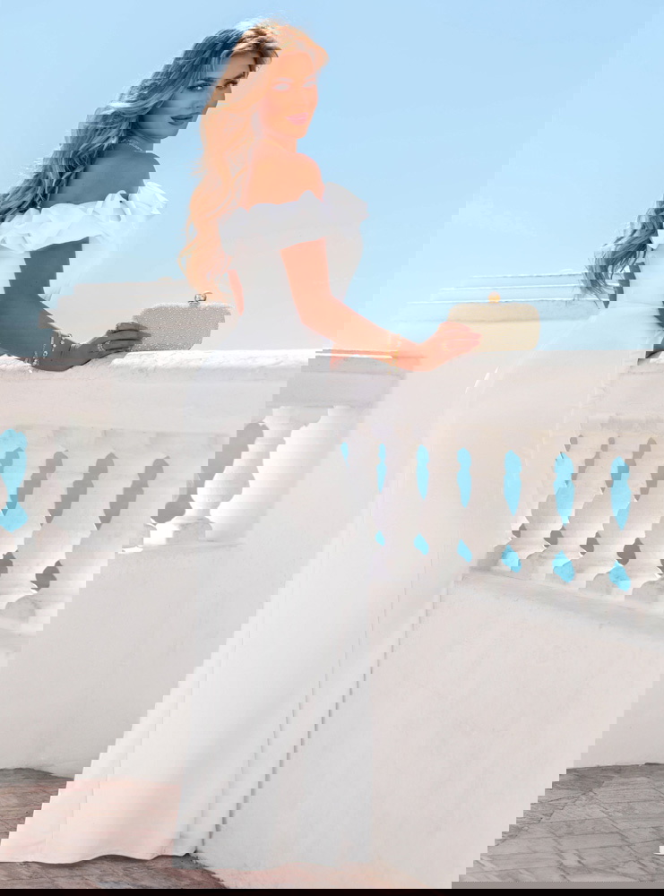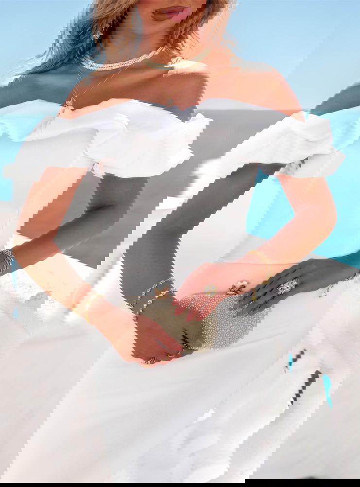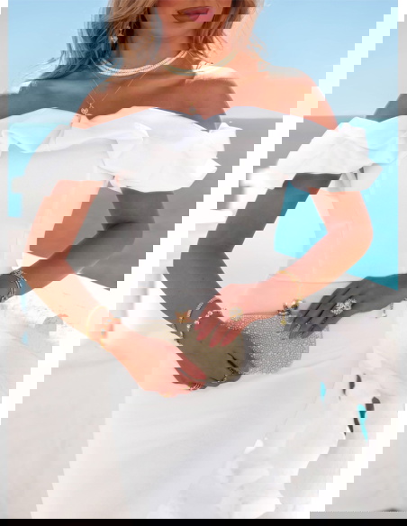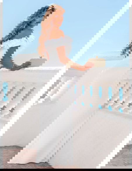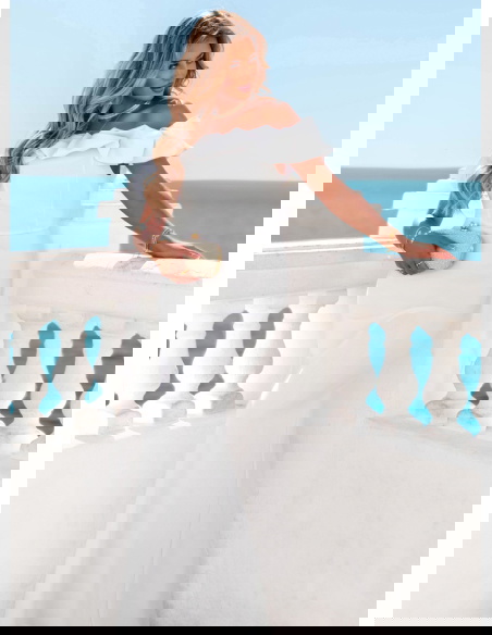 Biała długa sukienka typu hiszpanka z falbanką Aranelii to kwintesencja kobiecego wdzięku i elegancji inspirowanej śródziemnomorską romantyką. Model z kolekcji Costa Del Amor przyciąga wzrok subtelnym krojem z odkrytymi ramionami oraz delikatną falbaną, która miękko otula dekolt, nadając całości lekkości i świeżości. Dopasowany fason pięknie modeluje sylwetkę, podkreślając talię i biodra, a długość maxi nadaje formalnego, ślubnego charakteru. Biel sukienki rozświetla cerę i daje efekt nieskazitelnej klasy, doskonale sprawdzając się podczas wyjątkowych okazji – zarówno jako suknia ślubna, jak i kreacja na wieczór lub przyjęcie w stylu glamour. Sukienka jest idealna dla kobiet, które szukają elegancji z nutką romantyzmu, bez nadmiaru. To model, w którym poczujesz się wyjątkowo – subtelna, ale pewna siebie. Wystarczy delikatna biżuteria i kopertówka – resztę zrobi Twoja pewność siebie.