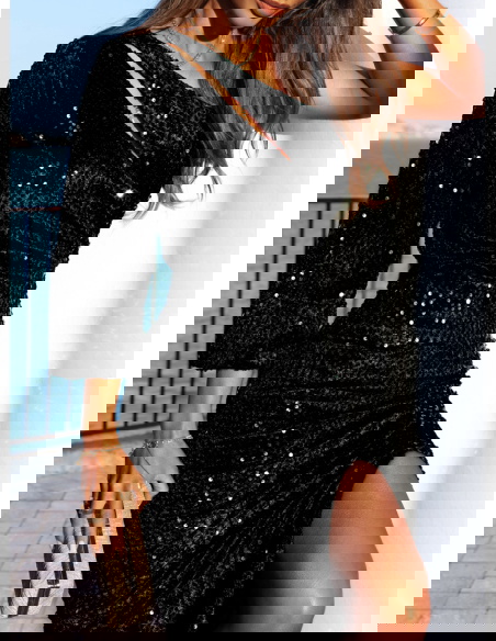 Czarna cekinowa sukienka na jedno ramię z rozcięciem Benitaa