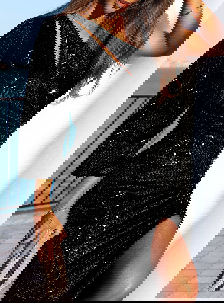 Czarna cekinowa sukienka na jedno ramię z rozcięciem Benitaa jest świetna na wesela, przyjęcia wieczorowe, bale, gale czy sylwestrowe szaleństwo. Idealna także jako kreacja dla druhny lub na wyjątkową sesję zdjęciową. Pasuje do stylizacji glamour – z połyskującymi dodatkami lub złotą biżuterią.