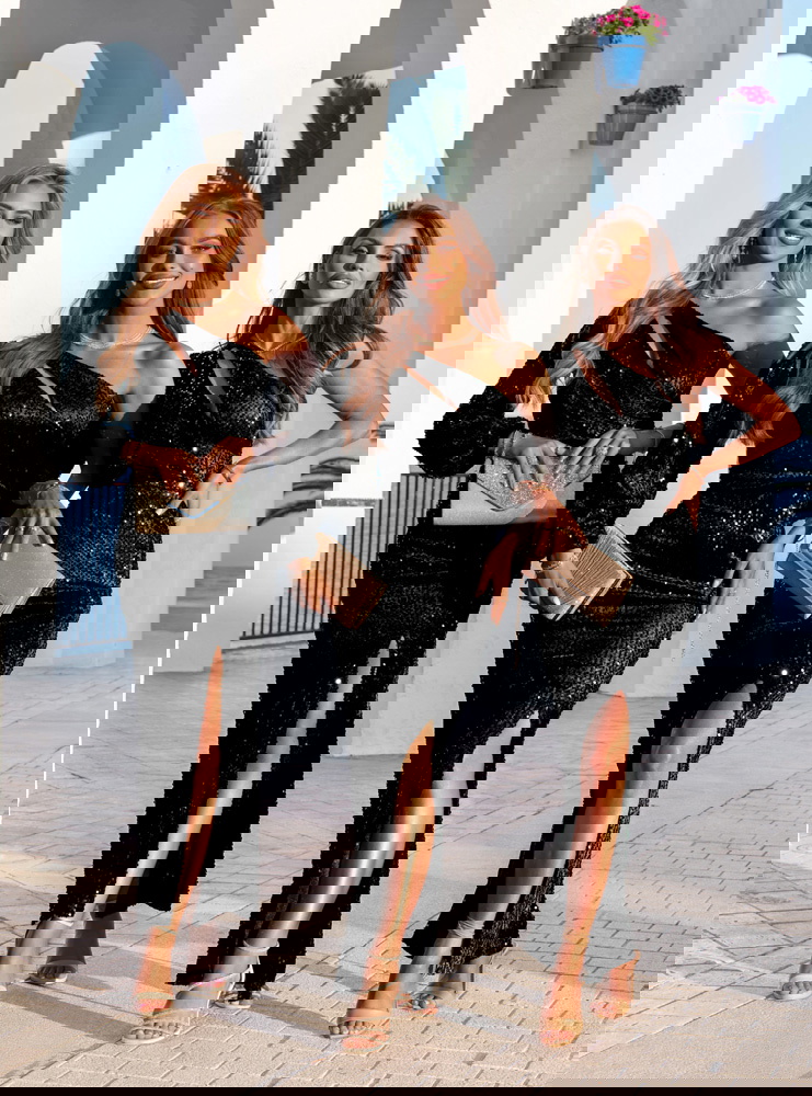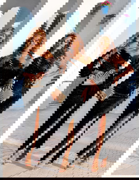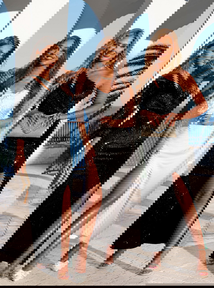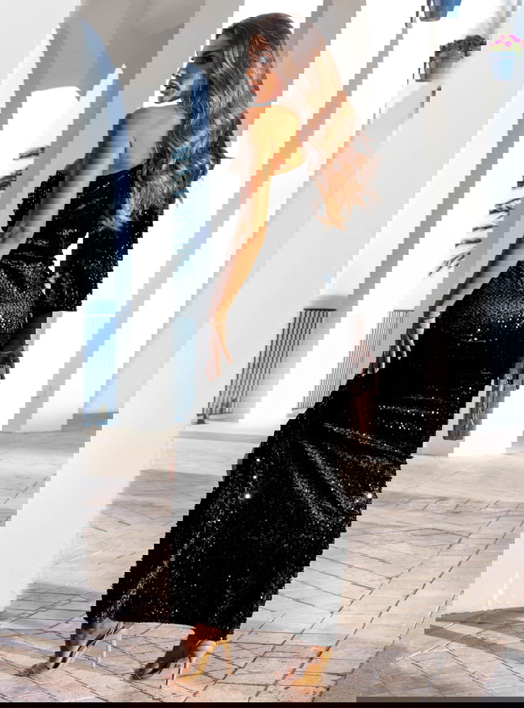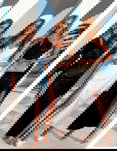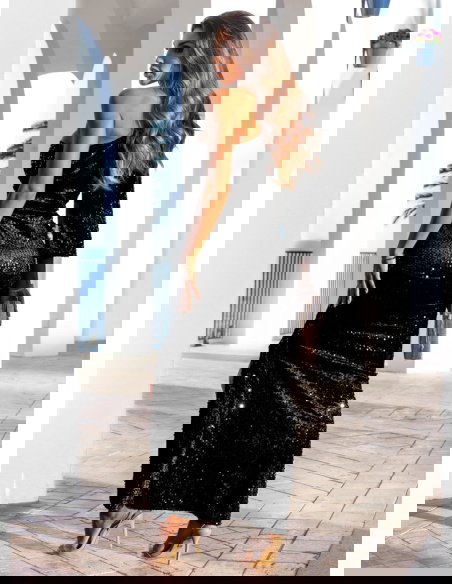 Czarna cekinowa sukienka na jedno ramię z rozcięciem Benitaa to propozycja z kolekcji Costa Del Amor stworzona dla kobiet, które kochają błysk, klasę i odważny design w jednym. Jej asymetryczny krój z odkrytym ramieniem i jednym, długim rękawem od razu przyciąga uwagę i wyróżnia ten model spośród klasycznych wieczorowych sukienek. Powierzchnia sukienki pokryta jest lśniącymi cekinami, które migoczą przy każdym ruchu, tworząc efekt wow. Długość maxi w połączeniu z wysokim rozcięciem na nodze zapewnia zmysłowość, a dopasowany krój pięknie podkreśla sylwetkę. Czerń nadaje całości elegancji i ponadczasowego charakteru, sprawiając, że to idealna sukienka na wyjątkowy wieczór, galę, wesele lub sylwestrową noc. To model, w którym poczujesz się jak gwiazda – pewna siebie, kobieca i absolutnie zjawiskowa.