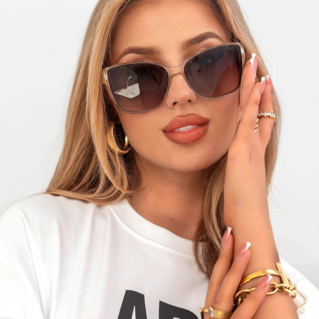 Szare okulary przeciwsłoneczne Myron to nie tylko praktyczny dodatek, ale też modny akcent każdej stylizacji. Model, który właśnie widzisz, to propozycja dla kobiet, które lubią wyróżniać się subtelną elegancją. Ich nowoczesny kształt i efektowne wykończenie sprawiają, że od razu przyciągają wzrok. Szerokie oprawki nadają charakteru i podkreślają rysy twarzy. Cieniowane szkła nie tylko świetnie się prezentują, ale też dodają nuty tajemniczości. Delikatne detale w odcieniach złota na zausznikach dodają całości luksusowego wyrazu. Ten model idealnie dopełnia zarówno casualowe, jak i bardziej eleganckie stylizacje. Pasują do rozpuszczonych włosów, kucyka, a nawet klasycznego koka. To okulary, które dodadzą Ci pewności siebie i modowego sznytu. Bez względu na to, dokąd się wybierasz – z nimi zawsze będziesz wyglądać stylowo.