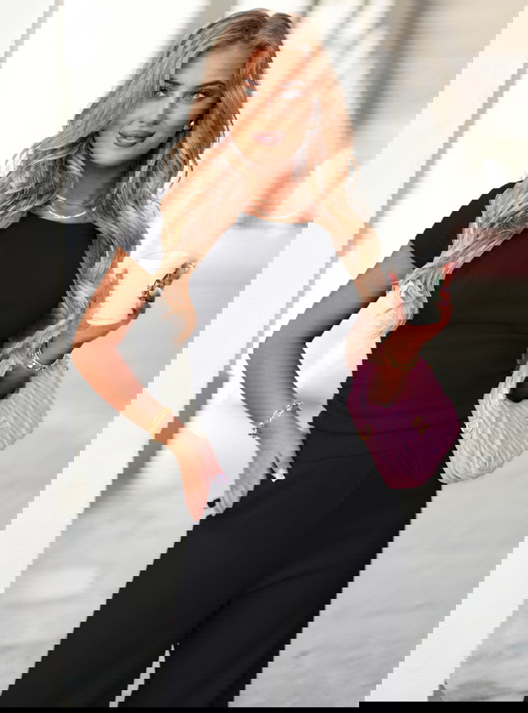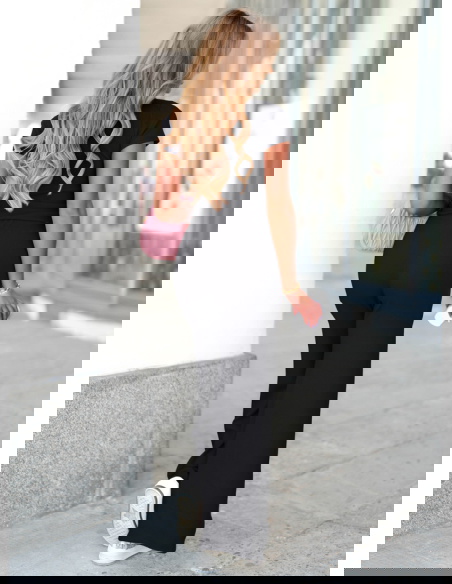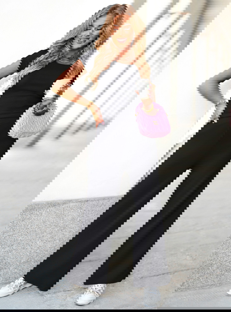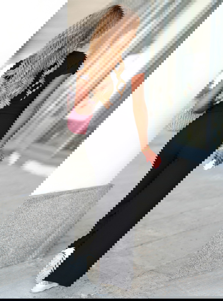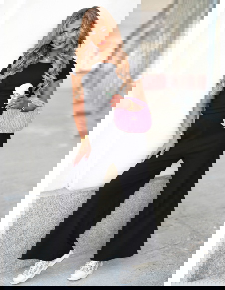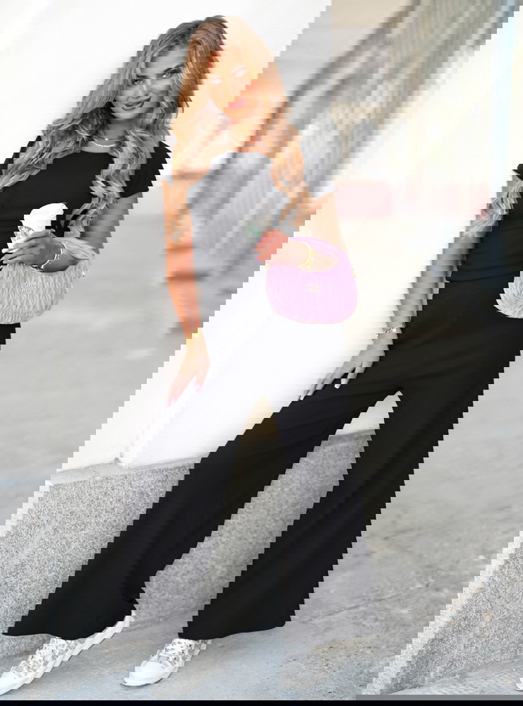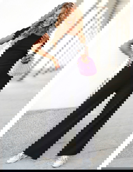 Czarny komplet prążkowany bluzka i szerokie spodnie Katheryn to klasyka, która nigdy nie wychodzi z mody. Składający się z krótkiej bluzki i szerokich spodni, stanowi wygodną i stylową bazę do codziennych stylizacji. Świetnie podkreśla sylwetkę i zapewnia swobodę ruchów. Minimalistyczna forma i uniwersalny kolor dają ogromne możliwości stylizacyjne. Założysz go zarówno na spacer, jak i na spotkanie w mieście czy wyjście na kawę. To świetna opcja na podróż – wygodna, ale nadal modna. Połącz z ulubionymi dodatkami i twórz sety na każdą okazję. Dzięki prostej formie możesz go nosić razem lub osobno – z marynarką, jeansową kurtką lub topem. Świetnie komponuje się ze sneakersami, ale też z klapkami lub sandałkami na obcasie. To outfit, który sprawdzi się podczas spacerów, zakupów, podróży czy spotkań ze znajomymi. Komfortowy i kobiecy – właśnie taki, jakiego szukasz na co dzień!
