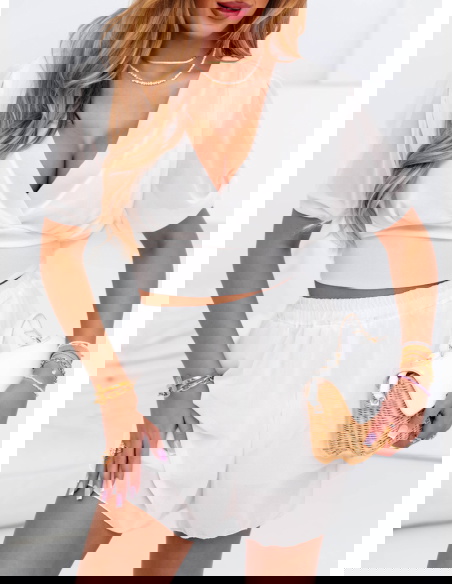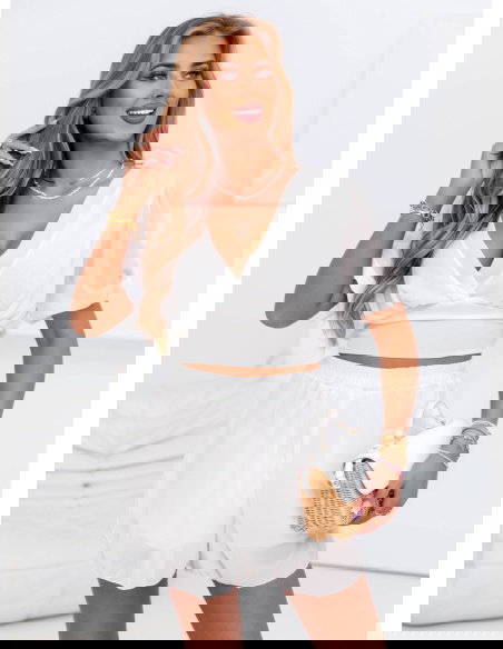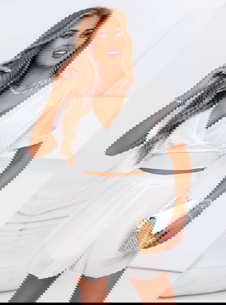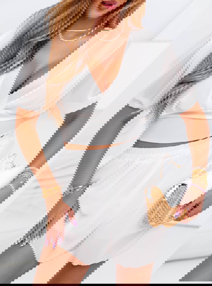 Biały komplet top i spodenki Nevenaa to zestaw, który nie potrzebuje wielu dodatków, by robić efekt „wow”. Pasuje zarówno do casualowych stylizacji, jak i bardziej dopracowanych zestawień. Wystarczy kilka biżuteryjnych akcentów i gotowe! Komplet składa się z krótkiego topu z kopertowym dekoltem oraz lekkich, luźnych spodenek z gumką w pasie. Całość tworzy harmonijny, letni look, który podkreśla sylwetkę, nie krępując ruchów. Delikatny, zwiewny krój nadaje lekkości i sprawia, że komplet pięknie prezentuje się w ruchu. Dzięki swojej prostocie zestaw pozwala na dużą dowolność w stylizacji – możesz dobrać do niego sneakersy, sandały lub szpilki. To idealna baza do stworzenia modnego, kobiecego outfitu.