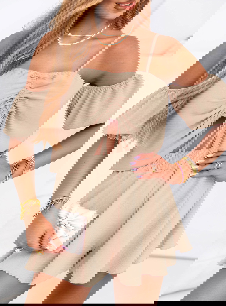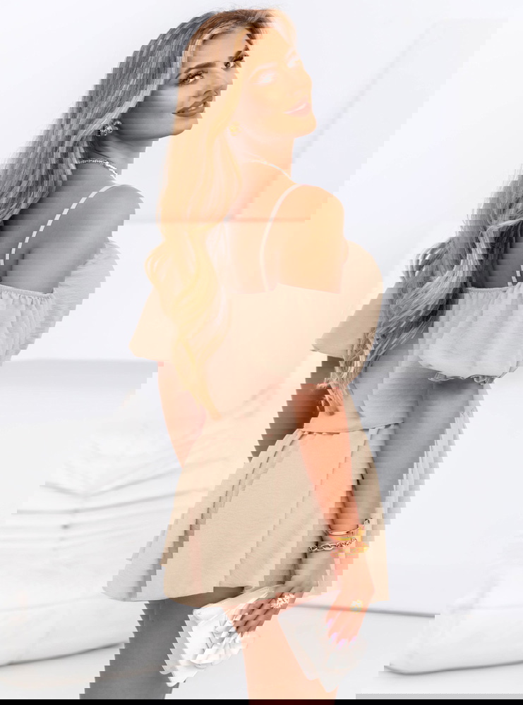 Beżowy komplet top i krótkie spodenki Dylaa to idealne połączenie kobiecego wdzięku i wakacyjnego luzu. Beżowa kolorystyka wprowadza spokój i harmonię, a przy tym pasuje praktycznie do wszystkiego. Delikatny top z odkrytymi ramionami subtelnie odsłania skórę, nadając całości zmysłowego charakteru. Marszczenia z przodu przyciągają wzrok i dodają ciekawego efektu wizualnego. Krótkie, zwiewne spodenki świetnie układają się na sylwetce i zapewniają maksymalny komfort. Całość prezentuje się lekko, świeżo i niezwykle dziewczęco.