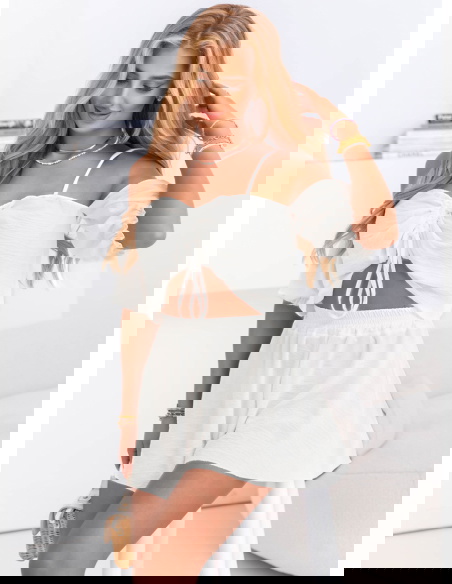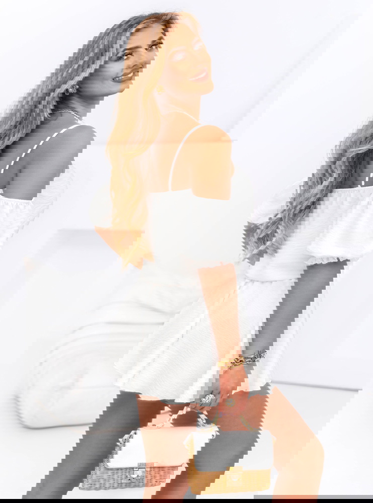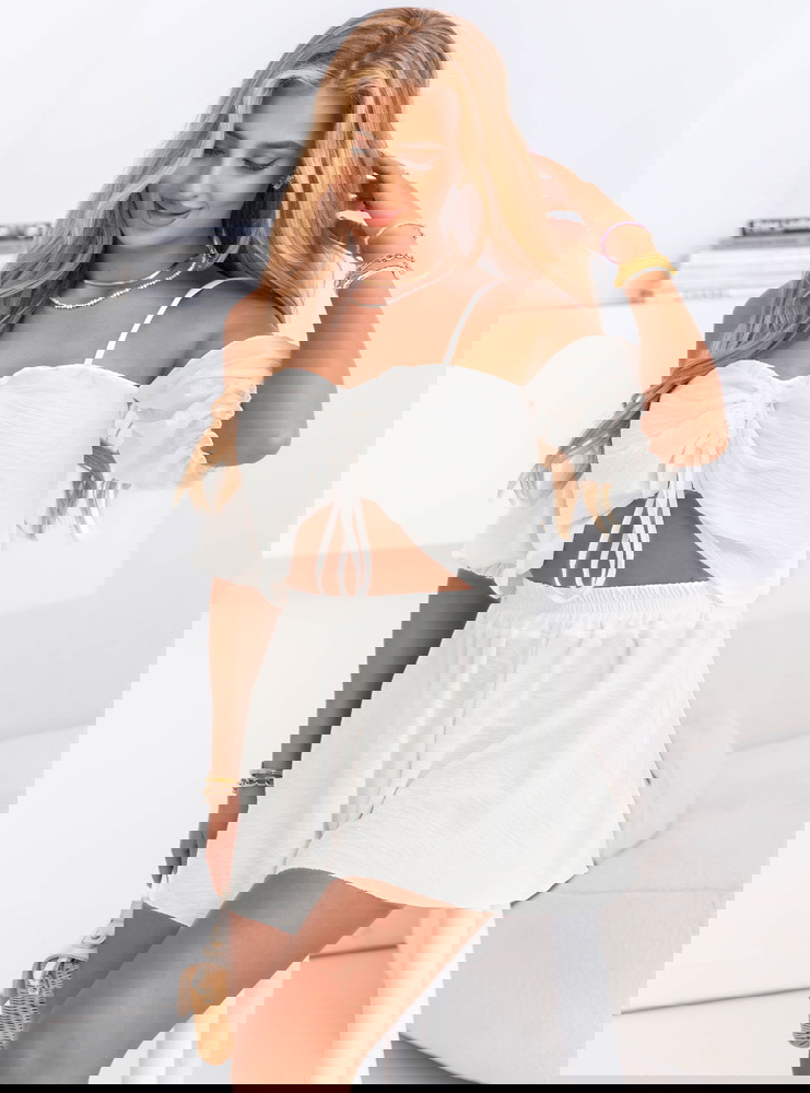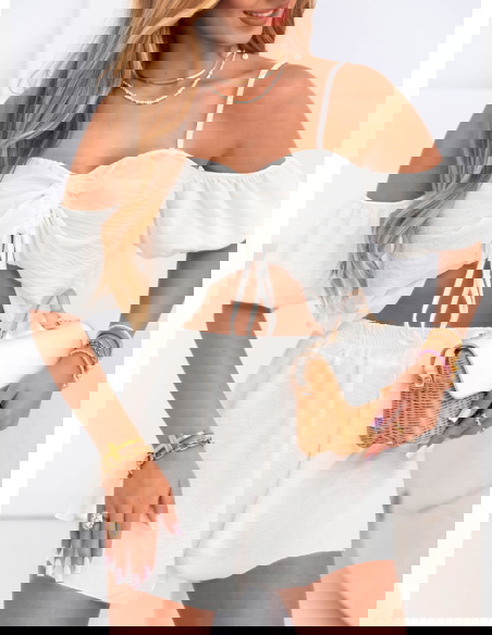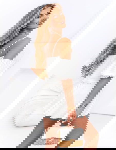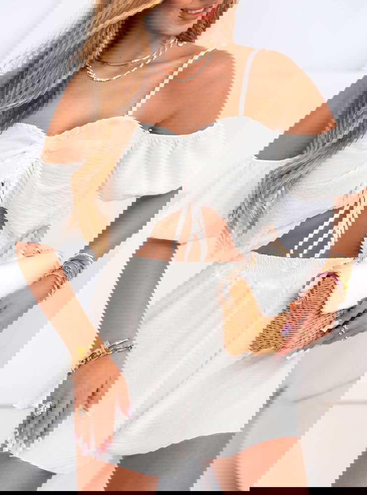 Biały komplet top i krótkie spodenki Dylaa to definicja letniej swobody i kobiecego stylu. Dzięki swojej formie dodaje lekkości i dziewczęcego wdzięku każdej stylizacji. Jest uniwersalny – wystarczy kilka dodatków, by nadać mu zupełnie inny charakter. Świetnie wygląda zarówno solo, jak i z narzuconą kurtką jeansową czy luźną koszulą.