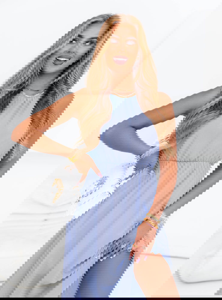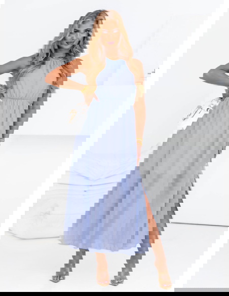 Błękitna sukienka maxi z rozcięciem Erlea to idealne połączenie wygody i stylu. Jej subtelny kolor i prosty krój sprawiają, że pasuje niemal do wszystkiego. To model, który z łatwością dopasujesz do swojego stylu – niezależnie od tego, czy wolisz sportowe akcenty, czy eleganckie dodatki.
