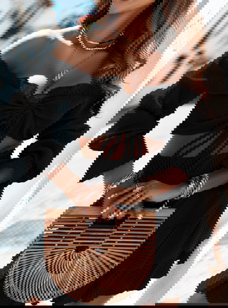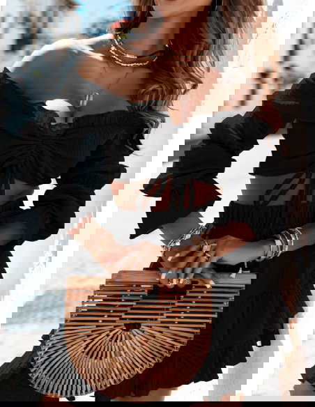 Czarny muślinowy komplet top typu hiszpanka i spódniczka Kristaina