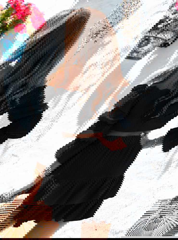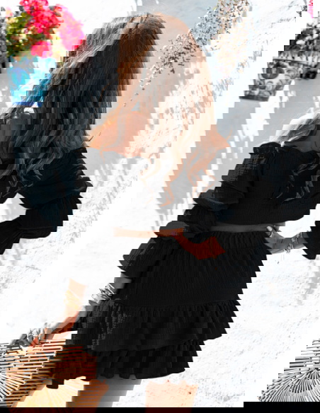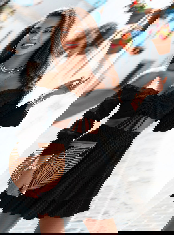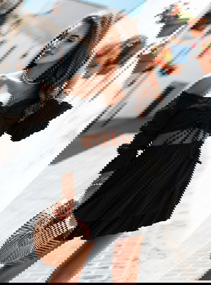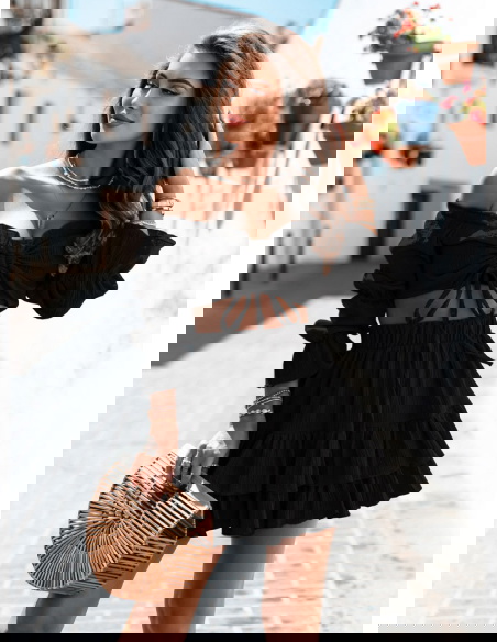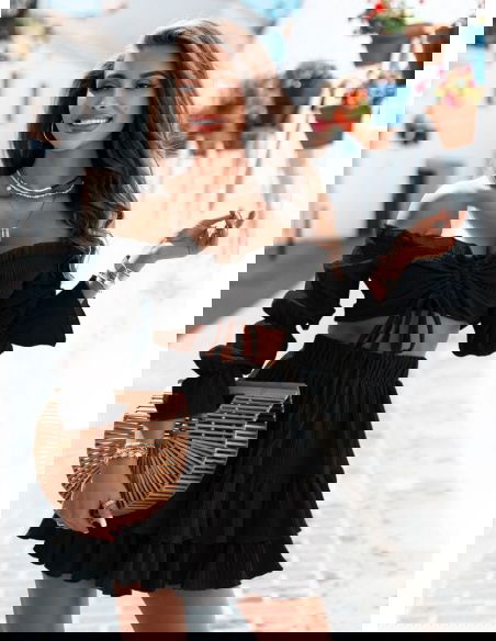 Czarny muślinowy komplet top typu hiszpanka i spódniczka Kristaina to klasyka w letnim wydaniu. Zestaw, który łączy w sobie elegancję, kobiecość i wakacyjny luz. Odkryte ramiona i efektowne wiązanie na przodzie subtelnie podkreślają sylwetkę. Góra pięknie eksponuje dekolt, a jednocześnie zapewnia wygodę i swobodę noszenia. Spódniczka z falbanami dodaje lekkości i rytmu każdemu krokowi. Kolor czarny dodaje całości ponadczasowego charakteru – pasuje na każdą okazję i świetnie komponuje się z dodatkami. To propozycja zarówno na codzienne spacery, jak i letnie wieczory w bardziej eleganckim wydaniu. Styl boho w czerni zyskuje wyrafinowany wymiar i pasuje do każdej karnacji. To komplet, w którym poczujesz się stylowo, niezależnie od sytuacji. Idealny wybór dla kobiet, które cenią modne, ale funkcjonalne rozwiązania.