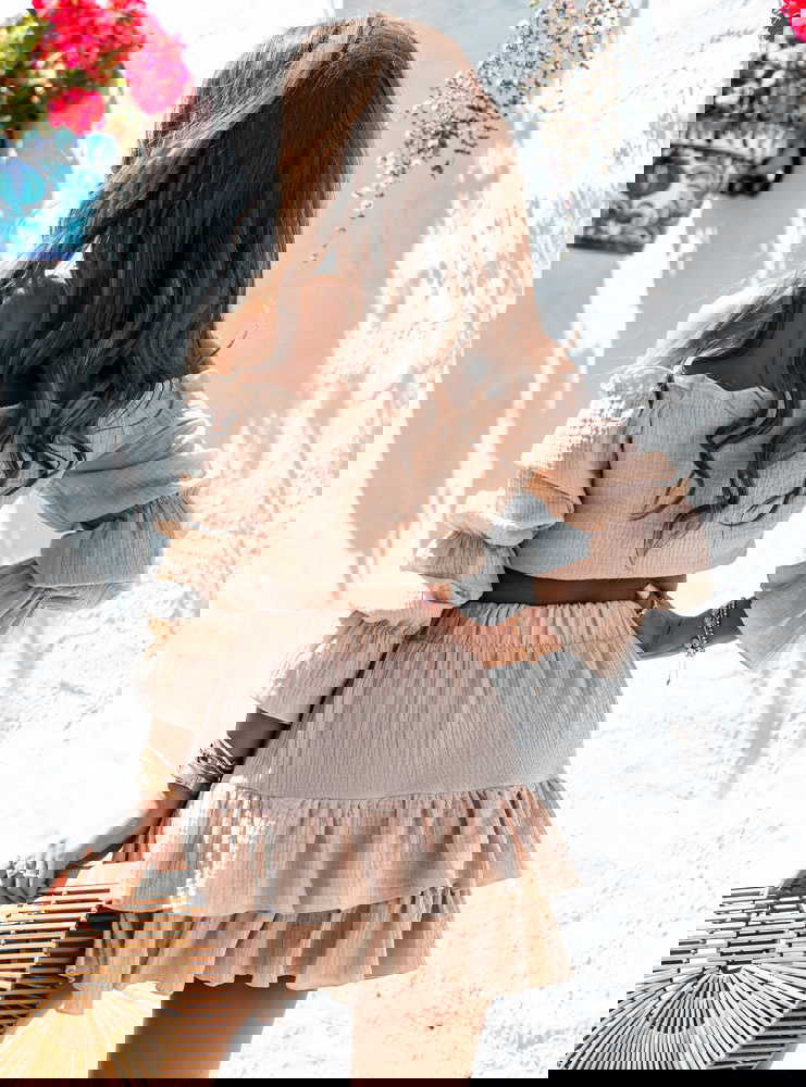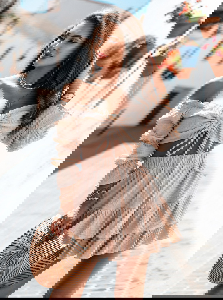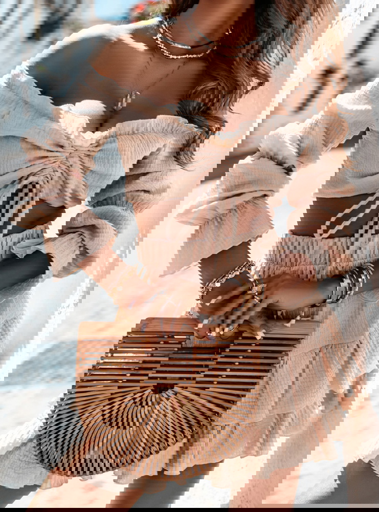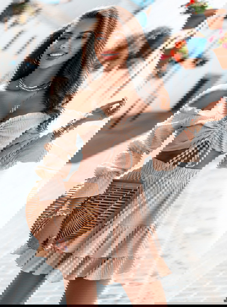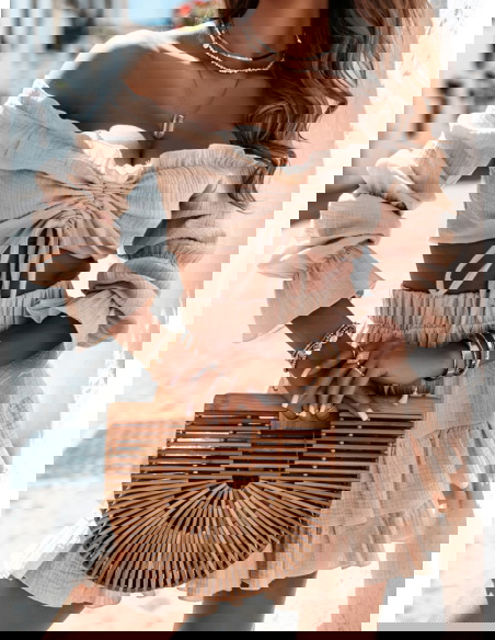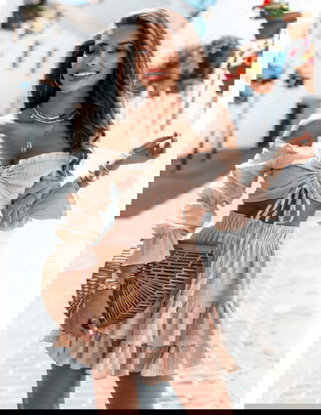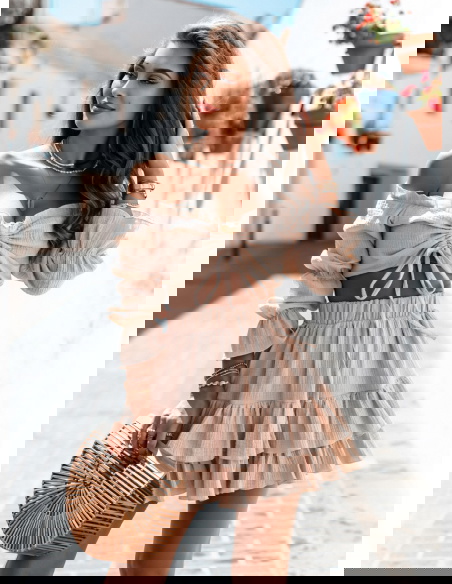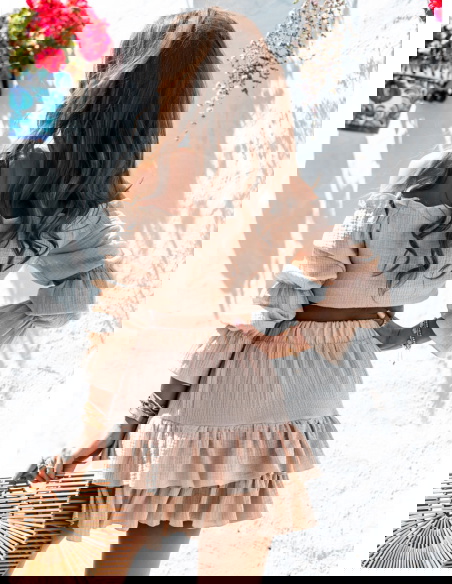 Beżowy muślinowy komplet top typu hiszpanka i spódniczka Kristaina to kwintesencja letniego stylu i kobiecego wdzięku. Jasny, beżowy odcień wprowadza świeżość i naturalność, która świetnie sprawdza się w ciepłe dni. Top typu hiszpanka z marszczeniem i wiązaniem na biuście eksponuje ramiona, dodając sylwetce lekkości. Bufiaste rękawy nadają romantycznego charakteru i przyciągają spojrzenia. Spódniczka z falbanami tworzy piękny efekt ruchu przy każdym kroku. Elastyczna talia zapewnia komfort noszenia, a całość świetnie układa się na ciele. Ten komplet to gotowy look – wystarczy dodać ulubione dodatki, by wyglądać stylowo. Idealny zarówno na spontaniczne wypady, jak i zaplanowane spotkania. Beżowa kolorystyka świetnie współgra z wakacyjną opalenizną. To propozycja dla kobiet, które cenią luz, ale nie rezygnują z modnego wyglądu.