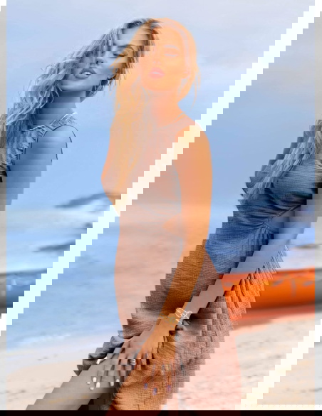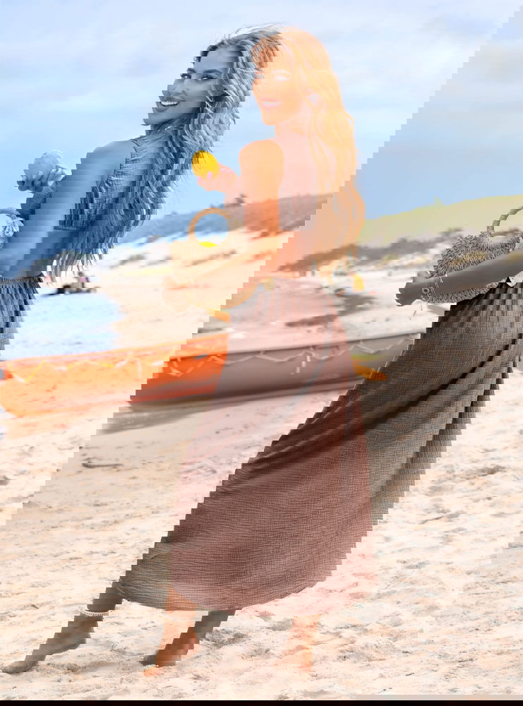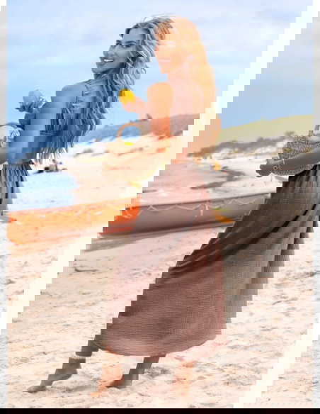 Muślinowa sukienka z odkrytymi plecami Tamyra - mocha mousse to propozycja dla kobiet, które kochają styl z nutą swobody. Jej prosty krój i lekki materiał sprawiają, że to sukienka idealna na gorące, letnie dni. Z pozoru skromna z przodu, zaskakuje tyłem – efektownie odkryte plecy dodają jej zmysłowego charakteru. To model, który możesz nosić boso po plaży albo z sandałkami na miejskim deptaku. Odcień mocha to spokojna, ciepła tonacja, która pasuje do każdego typu urody. Brak rękawów zapewnia pełną swobodę, a długość midi podkreśla sylwetkę, nie odsłaniając zbyt wiele. Dzięki elastycznemu tyłowi sukienka dobrze dopasowuje się do ciała, jednocześnie nie opinając go. Idealna do stylizacji typu boho, minimalistycznych looków albo w połączeniu z wakacyjną biżuterią. Można ją założyć na strój kąpielowy lub bezpośrednio na ciało – i w obu wersjach wygląda świetnie. To sukienka, która daje luz, ale nie rezygnuje z kobiecości.