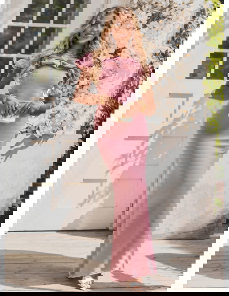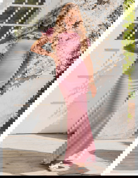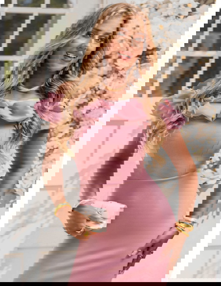 Długa sukienka typu hiszpanka z falbanką Nayme - brudny róż to połączenie klasy i kobiecej subtelności. Jej dopracowany krój sprawia, że prezentuje się elegancko, a jednocześnie pozostaje wygodna. Falbana przy dekolcie dodaje uroku i podkreśla ramiona w stylowy sposób. To model, który nie potrzebuje wielu dodatków – sam w sobie robi ogromne wrażenie.