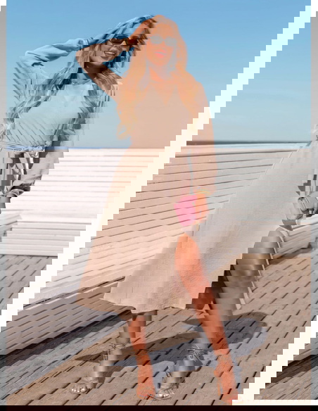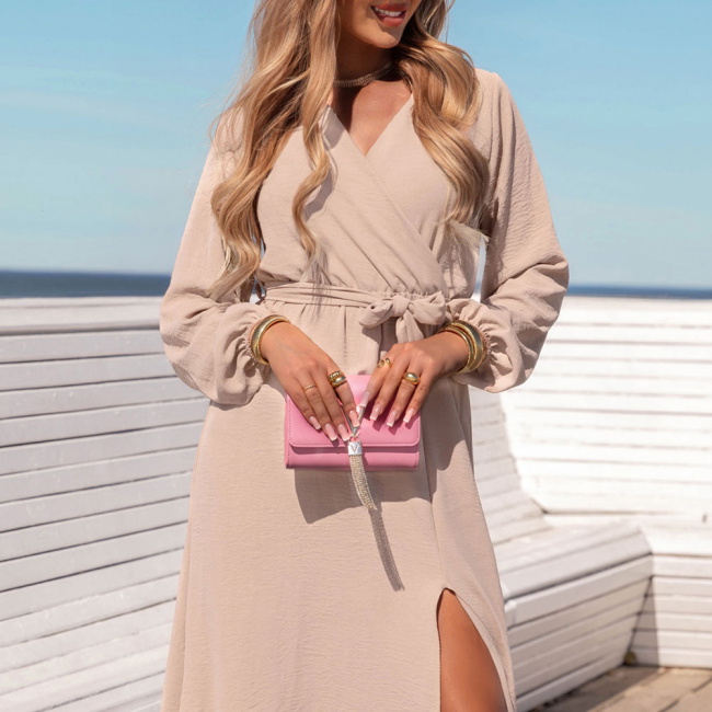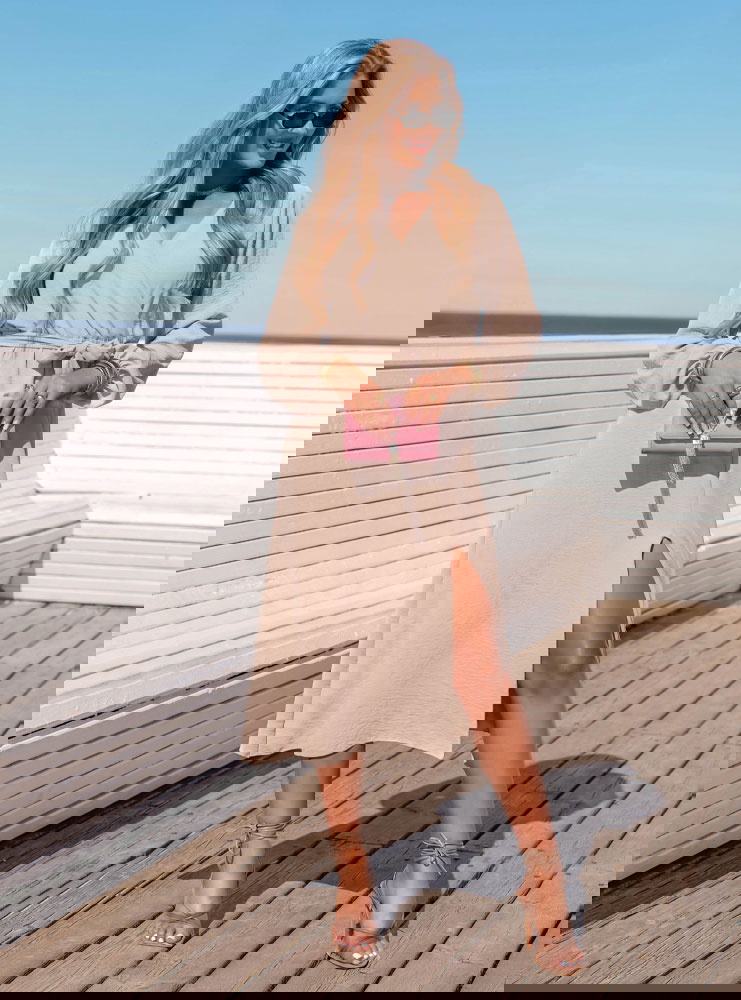 Beżowa sukienka midi z przekładanym dekoltem Tepin to połączenie klasyki i swobody w najlepszym wydaniu. Jej kobiecy krój, stonowany kolor i uniwersalny fason czynią ją świetną bazą do wielu stylizacji. Pasek w talii pozwala idealnie dopasować sukienkę do sylwetki, a dekolt i rozcięcie nadają lekkości. To model, który możesz stylizować w zależności od okazji – od casualu po elegancję.