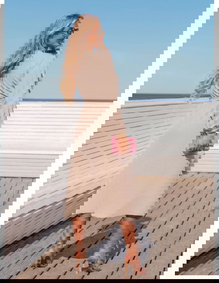 Beżowa sukienka midi z przekładanym dekoltem Tepin to doskonała propozycja dla kobiet, które cenią stylową prostotę i wygodę w jednym. Jej lekko rozkloszowany krój pięknie układa się w ruchu, a subtelny odcień beżu dodaje całości elegancji i świeżości. Przekładany dekolt w kształcie litery V wydłuża szyję i podkreśla biust w bardzo kobiecy, ale nienachalny sposób. Sukienka posiada długie rękawy zakończone delikatnym ściągaczem, dzięki czemu sprawdzi się także w chłodniejsze dni. Talia została zaakcentowana wiązanym paskiem, który podkreśla sylwetkę i pozwala na indywidualne dopasowanie. Długość midi jest uniwersalna – pasuje zarówno na co dzień, jak i na specjalne okazje. Dodatkowe rozcięcie z przodu dodaje sukience lekkości i nuty zmysłowości. To model, który daje swobodę stylizacji – możesz go nosić z klapkami, sandałkami czy eleganckimi szpilkami. Beż to kolor, który nigdy nie wychodzi z mody – pasuje do wszystkiego i wygląda szykownie w każdej odsłonie. To sukienka, którą będziesz chętnie zakładać niezależnie od okazji.