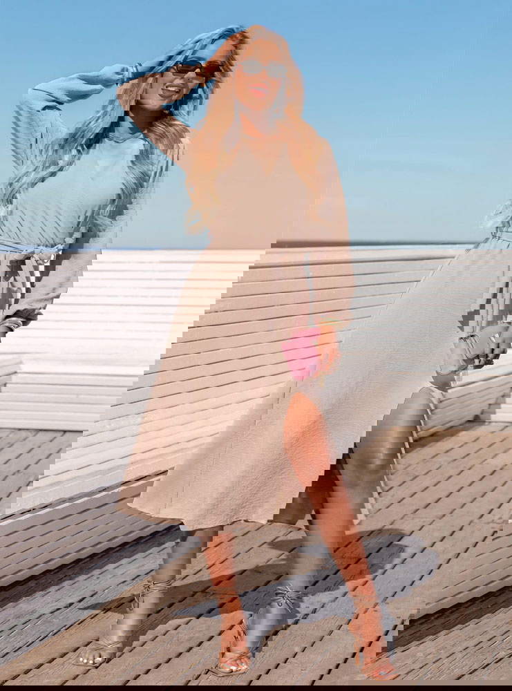 Beżowa sukienka midi z przekładanym dekoltem Tepin