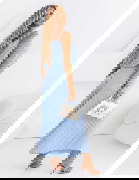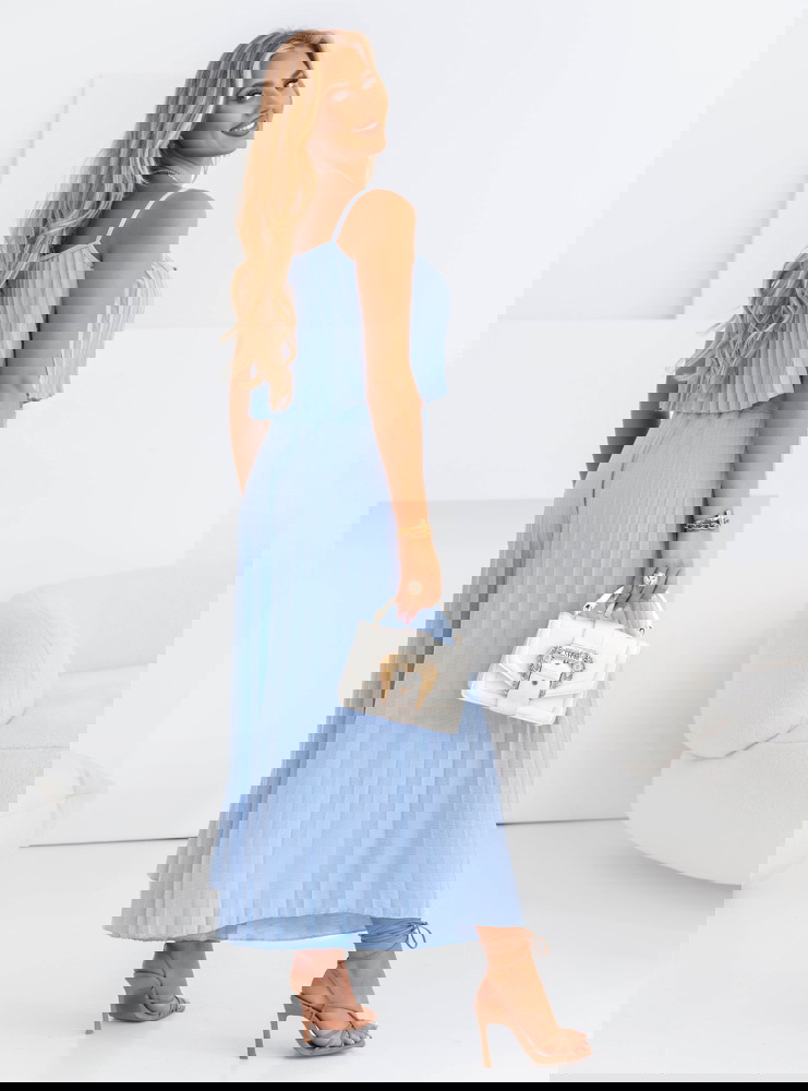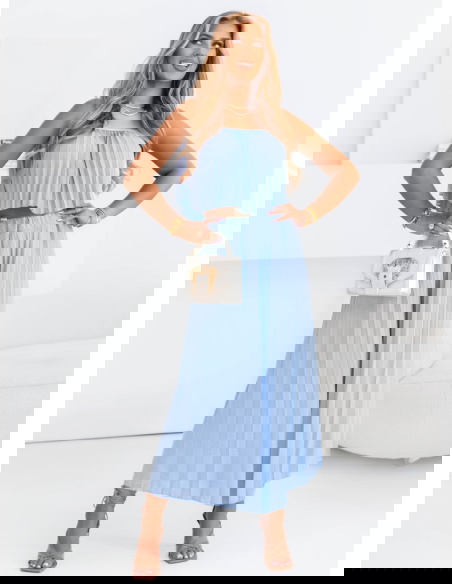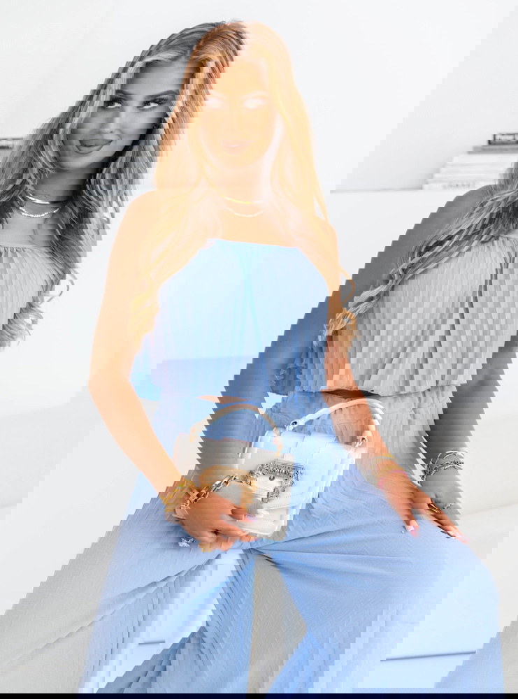 Błękitny plisowany komplet top i szerokie spodnie - to połączenie kobiecego uroku, wygody i stylu. Luźny top i szerokie spodnie tworzą razem zwiewną, ale bardzo efektowną całość. Jeśli szukasz czegoś lekkiego, kobiecego i uniwersalnego – ten komplet będzie idealnym wyborem.