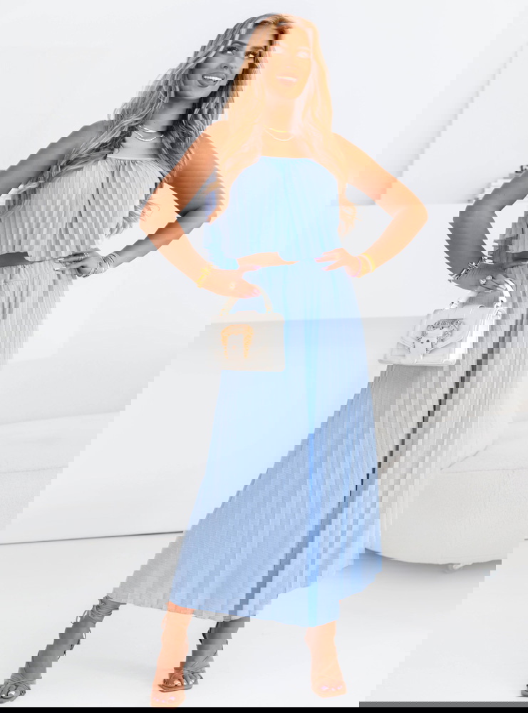 Błękitny plisowany komplet top i szerokie spodnie - to idealna propozycja na lato dla kobiet, które lubią wyglądać stylowo, nie rezygnując z komfortu. Delikatny, pastelowy odcień błękitu dodaje całości świeżości i subtelności. Top o luźnym, warstwowym kroju pięknie układa się na sylwetce i tworzy lekki, zwiewny efekt. Szerokie spodnie z wysokim stanem wydłużają optycznie nogi i zapewniają pełną swobodę ruchów. Plisowana struktura materiału nadaje kompletowi nowoczesnego charakteru i delikatnej elegancji. Ten zestaw to połączenie wakacyjnego luzu z miejskim szykiem. Świetnie sprawdzi się zarówno na wyjeździe, jak i na spacerze czy spotkaniu z przyjaciółkami. Możesz go zestawić z klapkami, sandałkami lub butami na obcasie, w zależności od okazji. Komplet świetnie wygląda również noszony oddzielnie – top z jeansami, spodnie z jednolitą koszulą lub crop topem. To prawdziwy must-have na ciepłe dni.