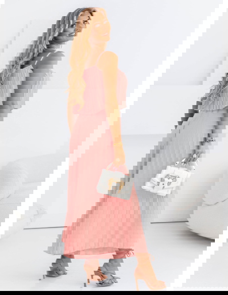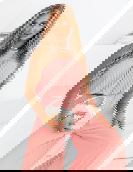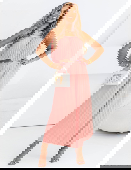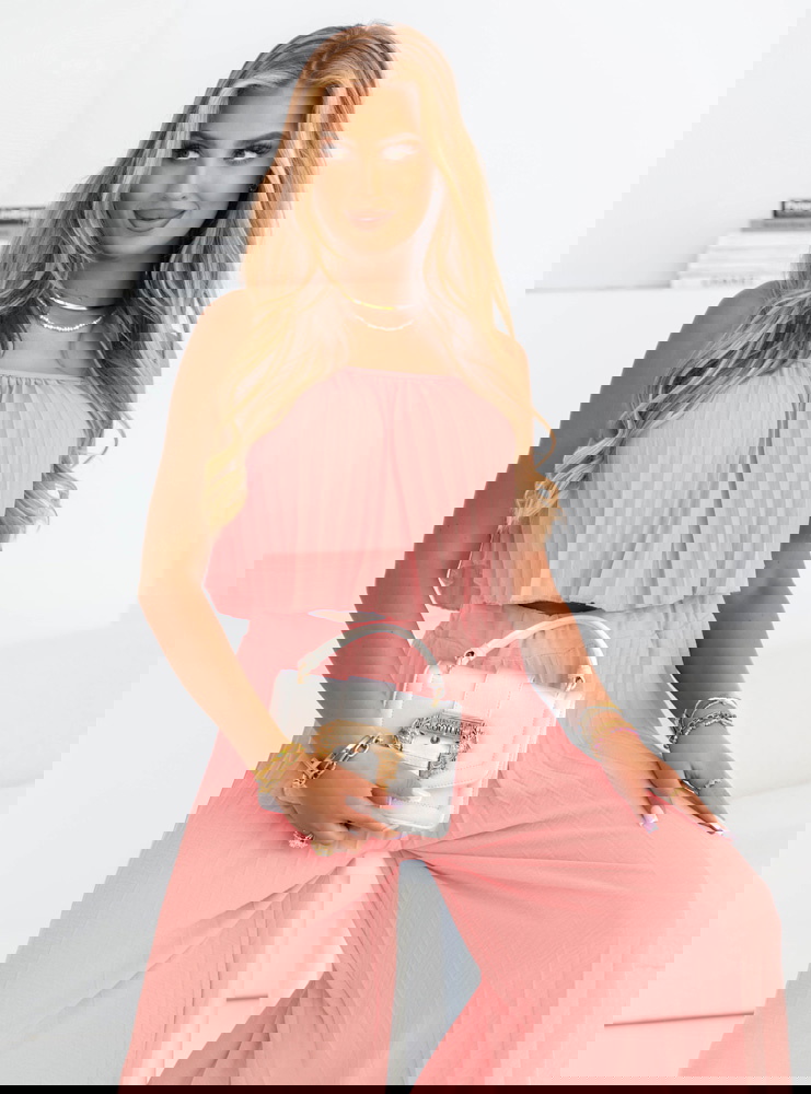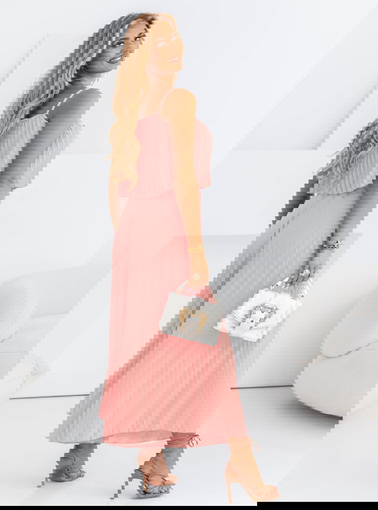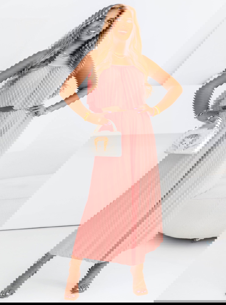 Pudrowy plisowany komplet top i szerokie spodnie Minnias to idealna baza wielu letnich stylizacji. Zachwyca kolorem, krojem i lekkością. Top i spodnie tworzą zgrany duet, który można stylizować razem lub osobno. Plisowanie dodaje całości nowoczesnego sznytu i elegancji. Wysoki stan spodni modeluje sylwetkę, a ramiączka topu podkreślają linię ramion. To idealna opcja na lato – lekka, kobieca i uniwersalna. Jeśli szukasz zestawu, który jest zarówno stylowy, jak i praktyczny – ten model będzie doskonałym wyborem.