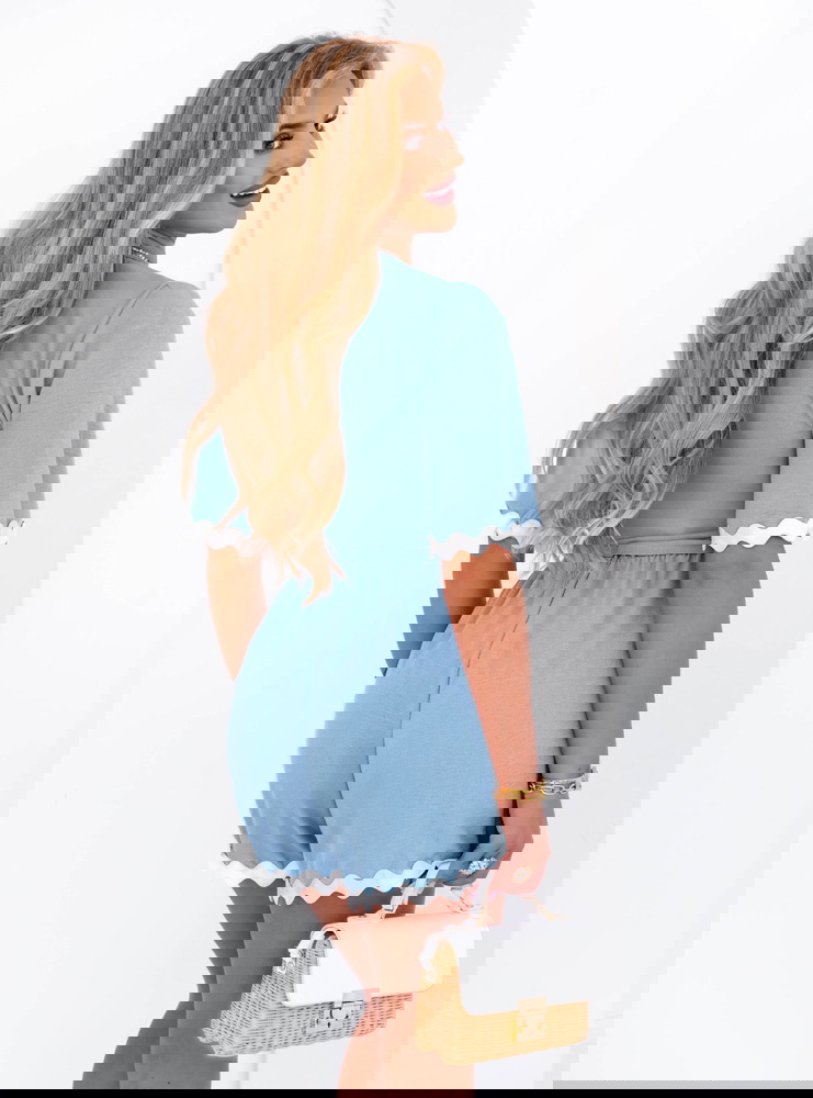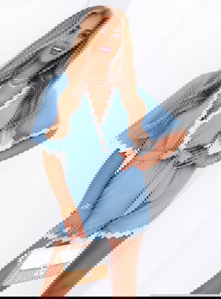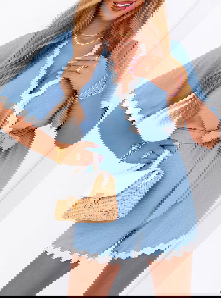Błękity krótki kombinezon z paskiem Vinalyn to must-have na lato. Łączy wygodę noszenia z wyjątkowym designem. Jego pastelowy odcień i ozdobna lamówka nadają mu świeżości i uroku. Pasek w talii pozwala dopasować go do sylwetki i dodać kobiecego akcentu. Luźny fason zapewnia komfort, a krótki krój świetnie sprawdzi się podczas ciepłych dni. To idealny wybór na każdy dzień, kiedy chcesz wyglądać stylowo i czuć się swobodnie. Wystarczy jeden element, by stworzyć kompletny letni zestaw – bez zbędnych dodatków.