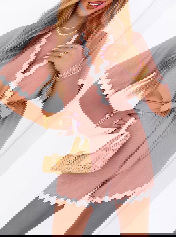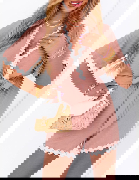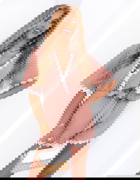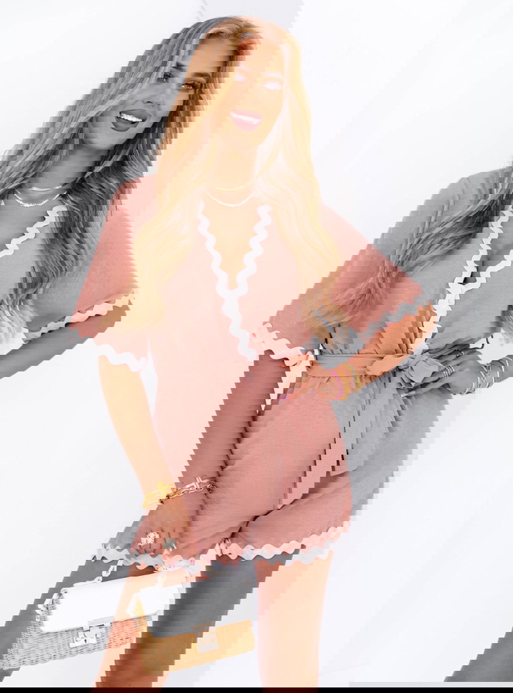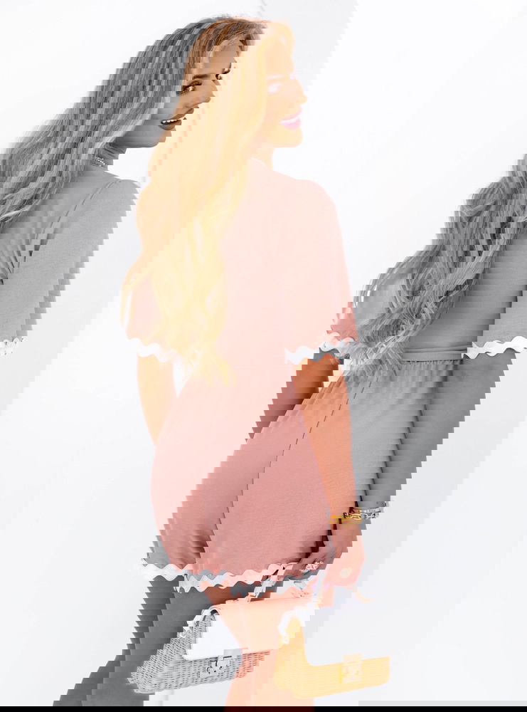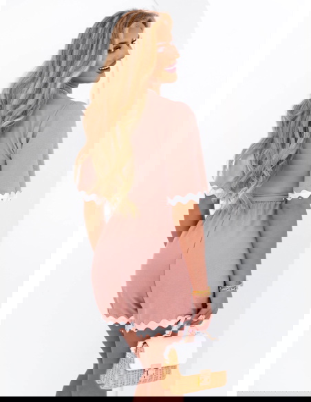 Krótki kombinezon z paskiem Vinalyn - brudny róż to połączenie subtelnej elegancji z wygodą na co dzień. Ten uroczy model natychmiast przyciąga wzrok dzięki delikatnemu kolorowi i dekoracyjnemu wykończeniu. Falowana biała lamówka dodaje całości lekkości i dziewczęcego uroku. Dekolt w kształcie litery V wysmukla szyję, a pasek w talii pozwala pięknie podkreślić sylwetkę. Kombinezon ma luźny, komfortowy fason, który idealnie sprawdzi się latem. Krótkie rękawy i nogawki gwarantują wygodę i przewiewność. To stylowa propozycja zarówno na codzienne wyjścia, jak i letnie spotkania ze znajomymi. Świetnie komponuje się z lekkimi sandałkami, torebką typu koszyk czy biżuterią w złotych odcieniach. Jego pastelowy kolor pasuje do wielu typów urody i dodaje świeżości całemu lookowi. Ten model to gwarancja komfortu i kobiecego wyglądu w jednym.