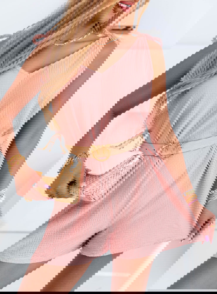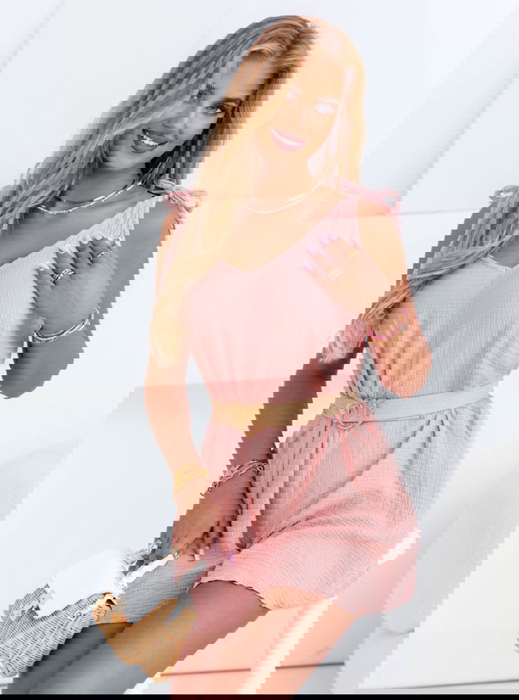 Muślinowy kombinezon na ramiączkach Yaritza - brudny róż to idealna propozycja na lato dla kobiet ceniących wygodę i dziewczęcy urok. Jego lekki, przewiewny krój sprawia, że doskonale sprawdza się nawet w upalne dni. Kombinezon ma luźną górę z delikatnym dekoltem w literę V, która pięknie eksponuje szyję i ramiona. Regulowane ramiączka wiązane na kokardki dodają uroku i pozwalają dopasować fason do sylwetki.