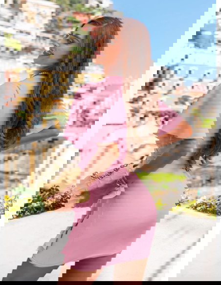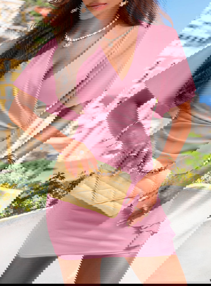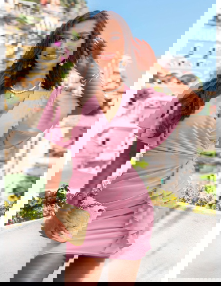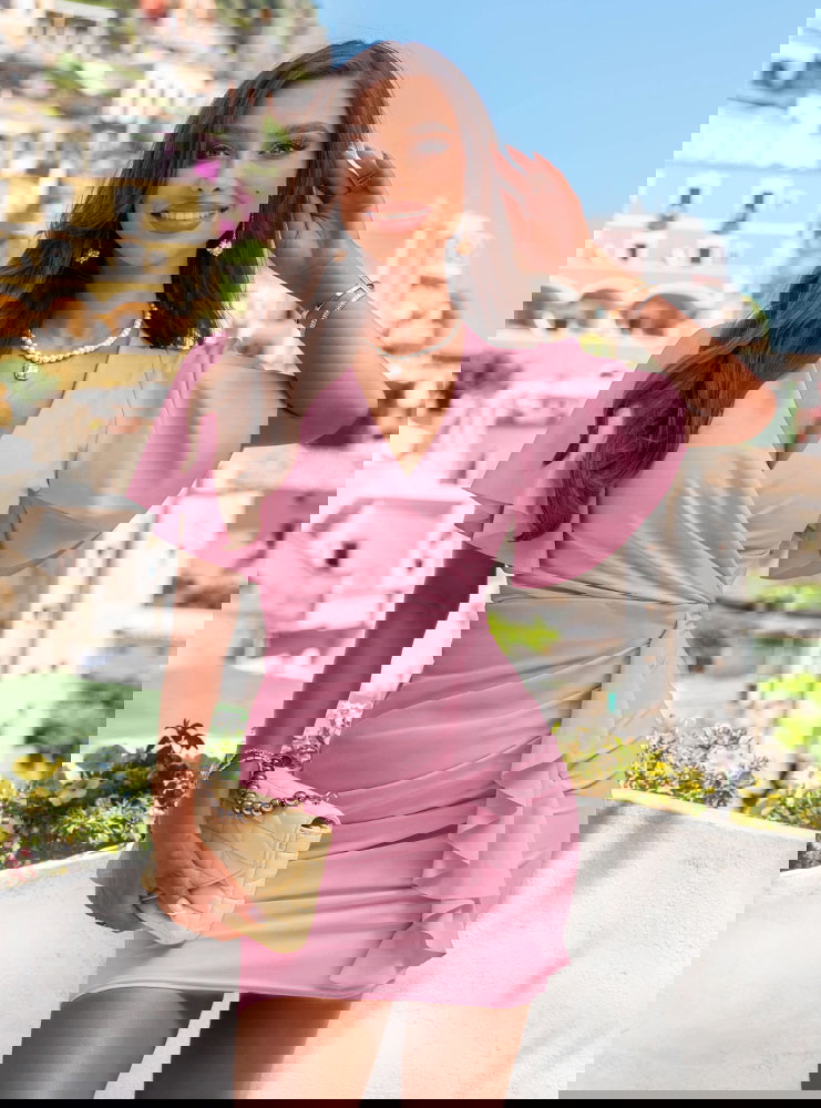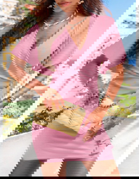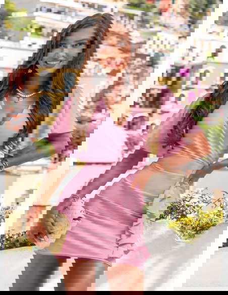 Sukienka z przekładanym dekoltem Riccarda - brudny róż to idealna sukienka na letnie przyjęcia, randki, rodzinne uroczystości czy romantyczne kolacje. Sprawdzi się również podczas wyjazdu – lekka, wygodna i efektowna zarazem.
