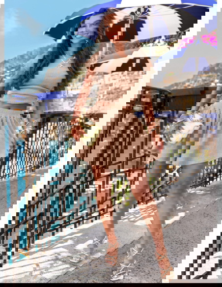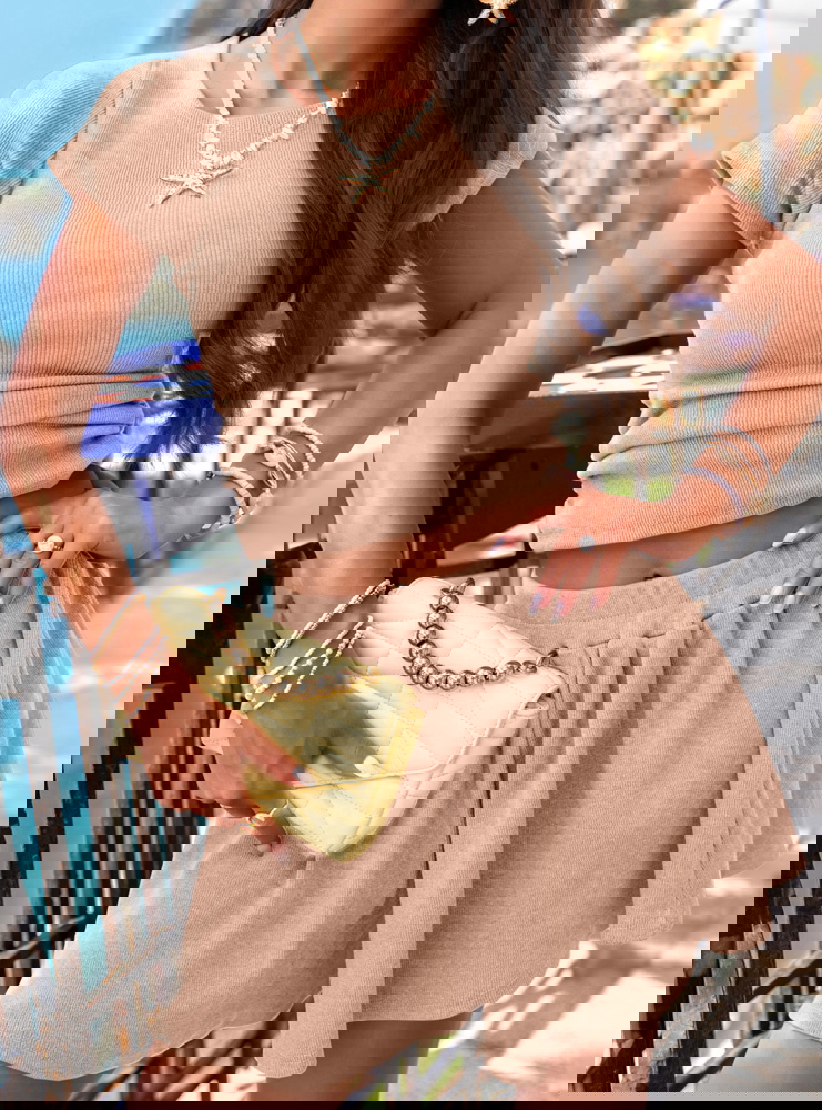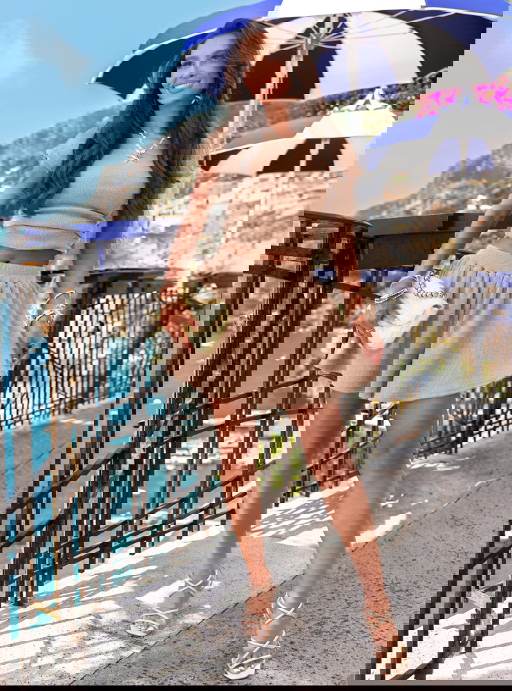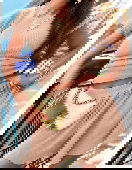 Beżowy komplet prążkowany bluzka i szerokie spodenki Ludovicca to idealny komplet na codzienne, wakacyjne chwile – od porannego cappuccino po wieczorne spacery promenadą. Doskonale sprawdzi się podczas zwiedzania, zakupów lub relaksu na tarasie z widokiem na morze.