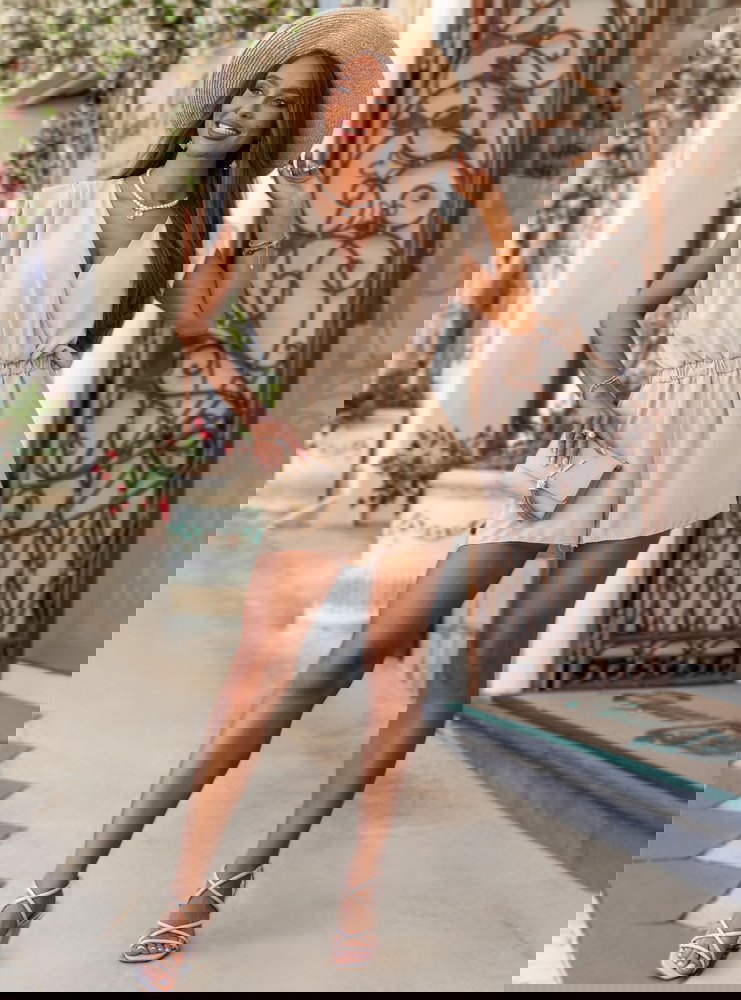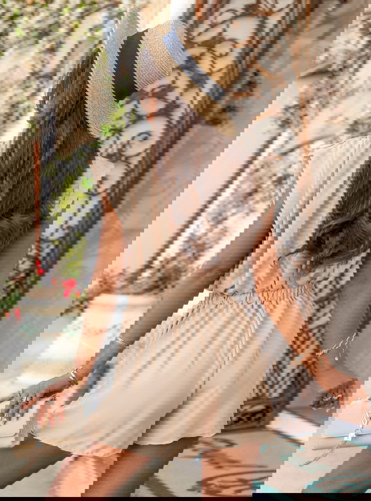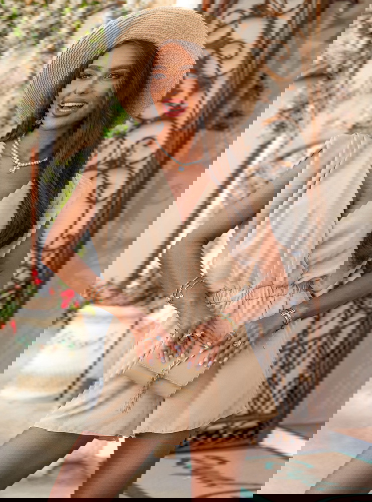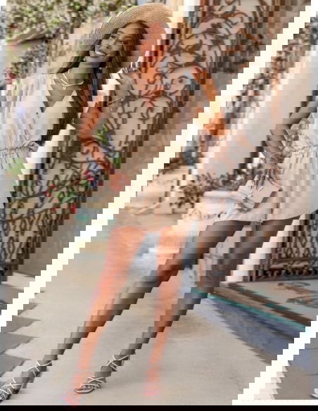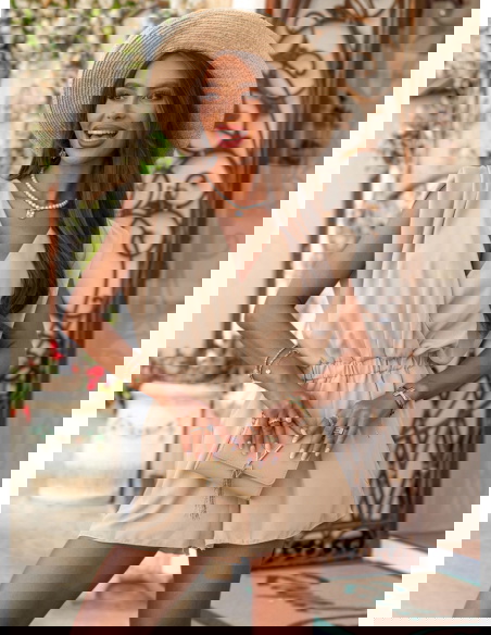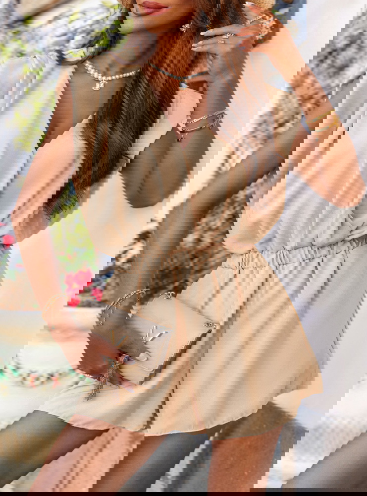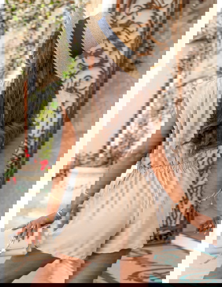 Beżowy kombinezon z przekładanym dekoltem Michela to kwintesencja lekkości i kobiecego stylu. Został stworzony z myślą o wakacyjnych dniach, ale z powodzeniem sprawdzi się też w codziennych stylizacjach.