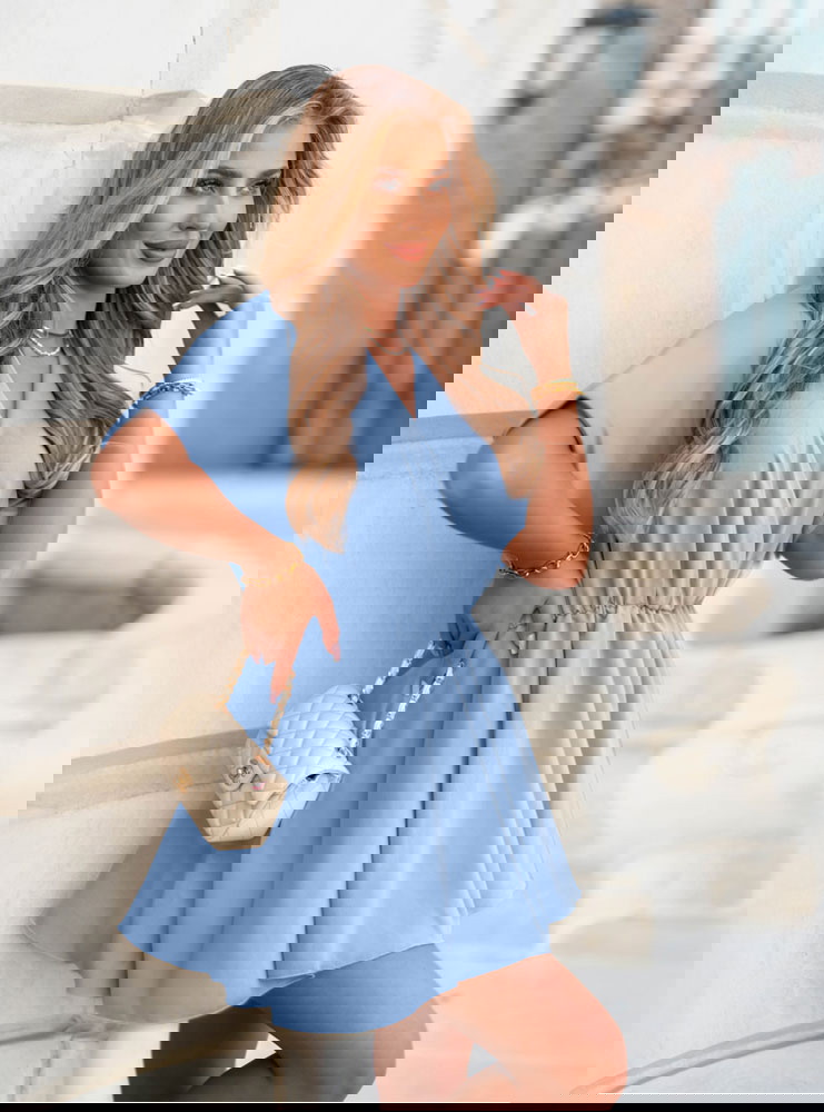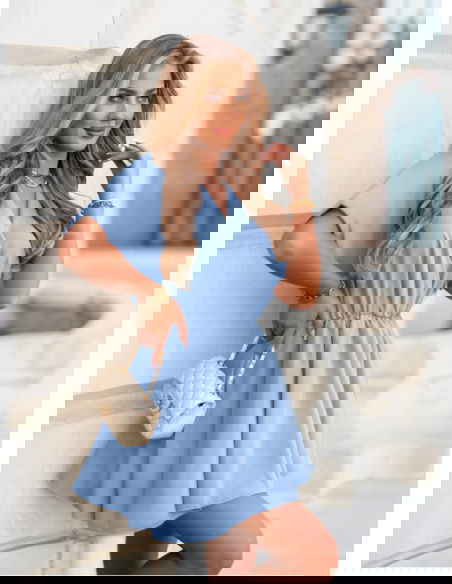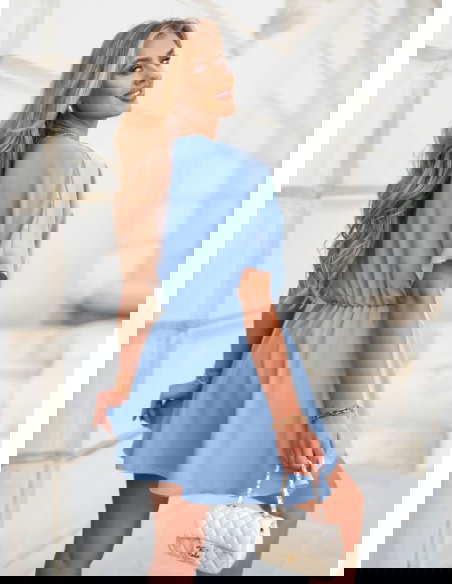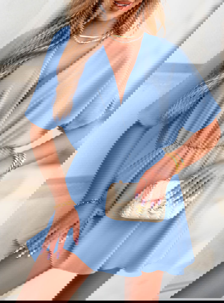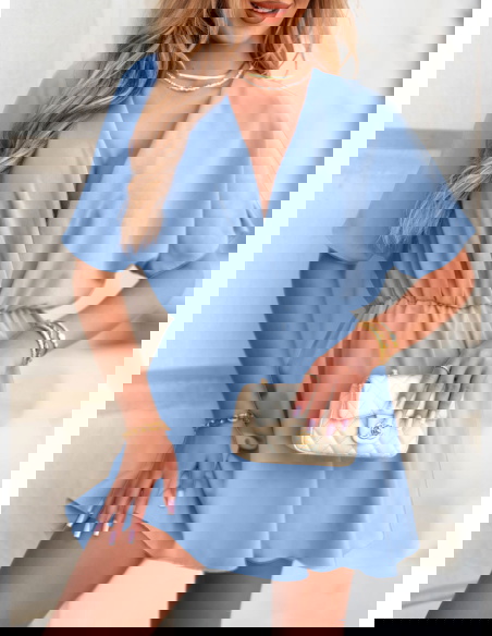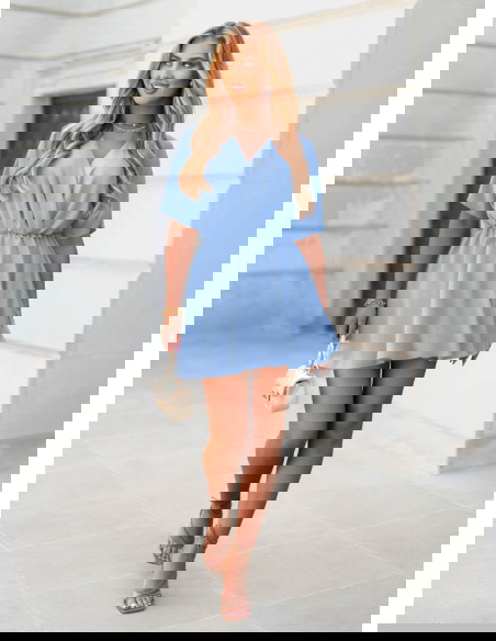 Błękitny kombinezon jak sukienka z przekładanym dekoltem Kristeena