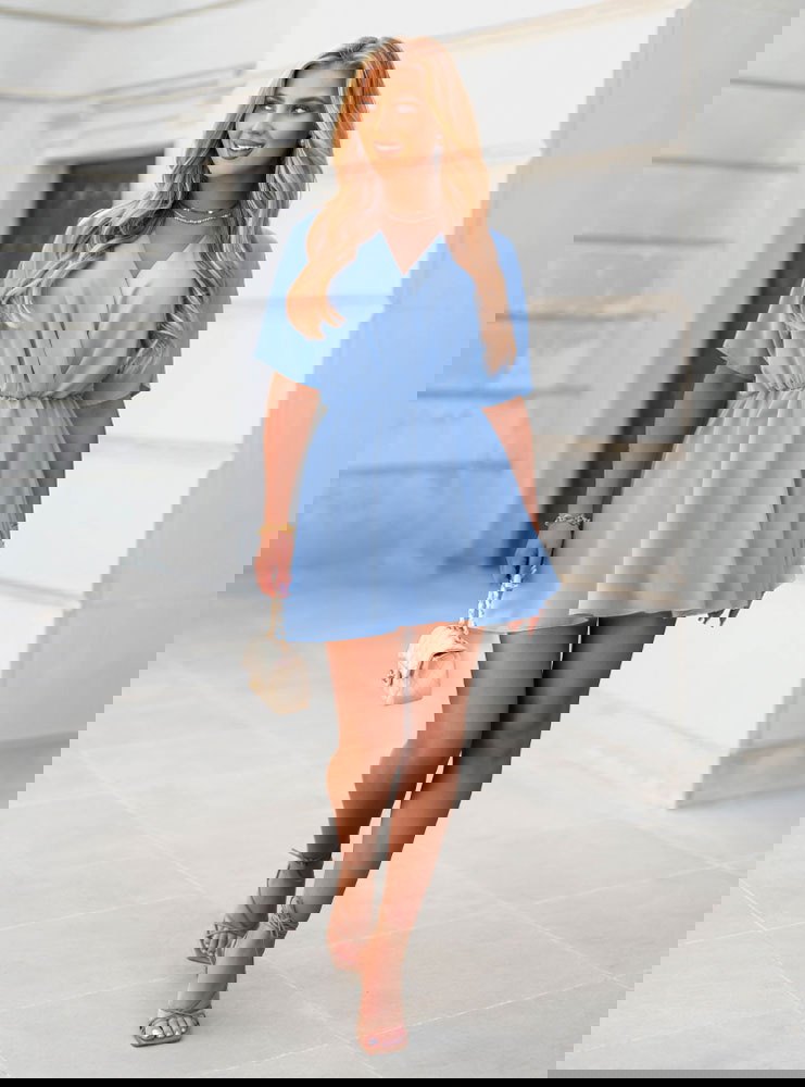 Błękitny kombinezon jak sukienka z przekładanym dekoltem Kristeena to uniwersalny model, który świetnie odnajdzie się w każdej kobiecej garderobie. Sprawia, że czujesz się dobrze ubrana bez wysiłku.